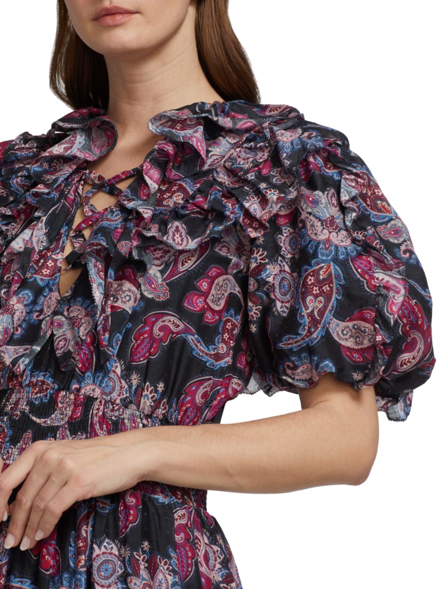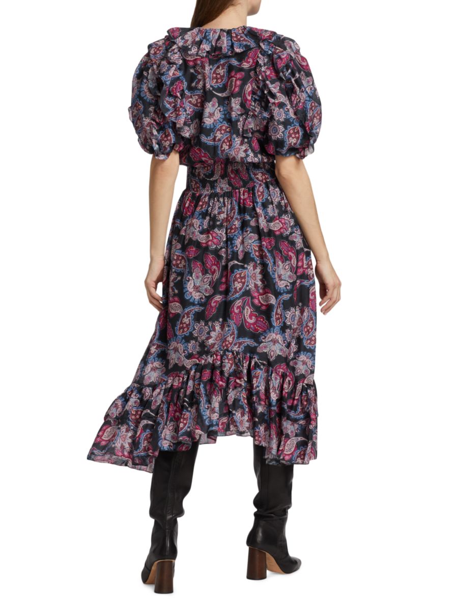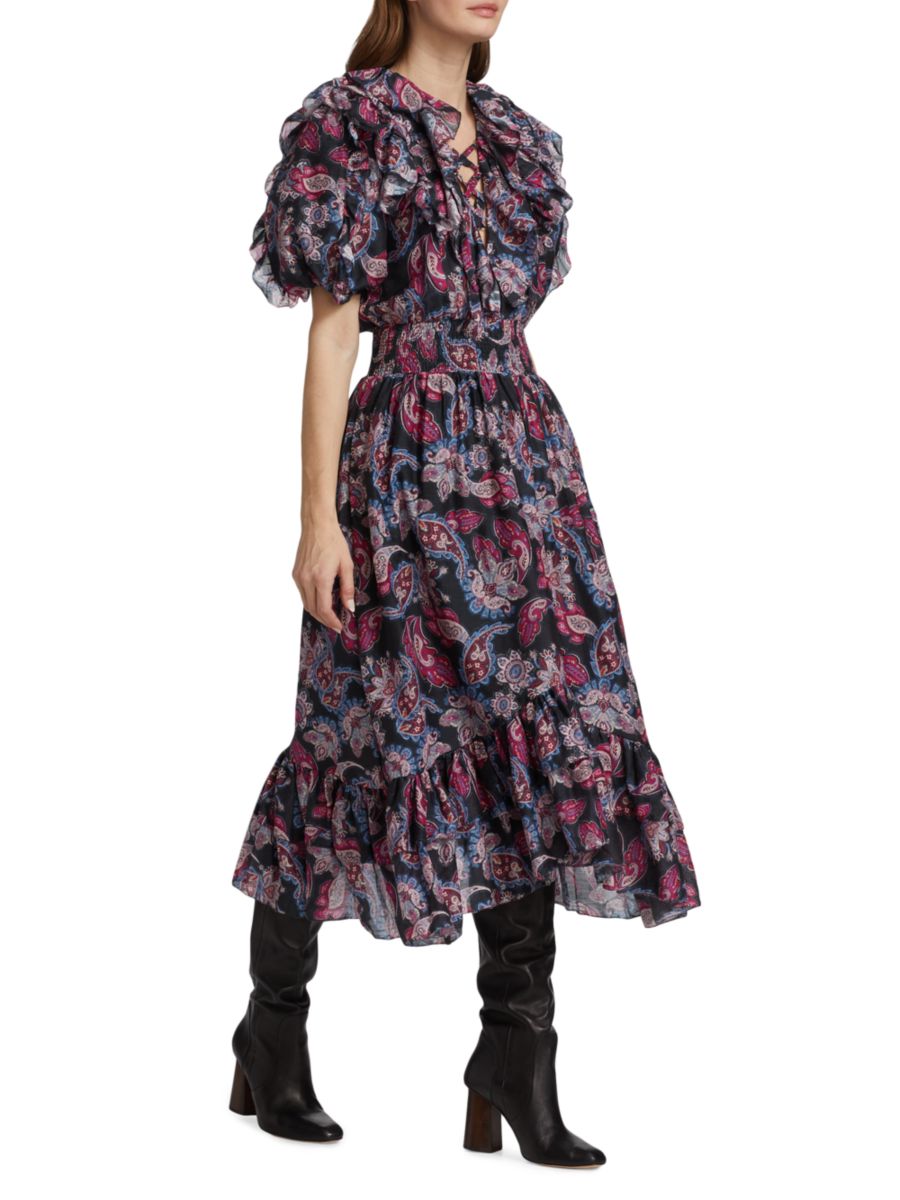 Платье миди Patricia, выполненное из смеси хлопка и шелка с узором пейсли, дополнено рукавами-буфами и многоярусной юбкой.