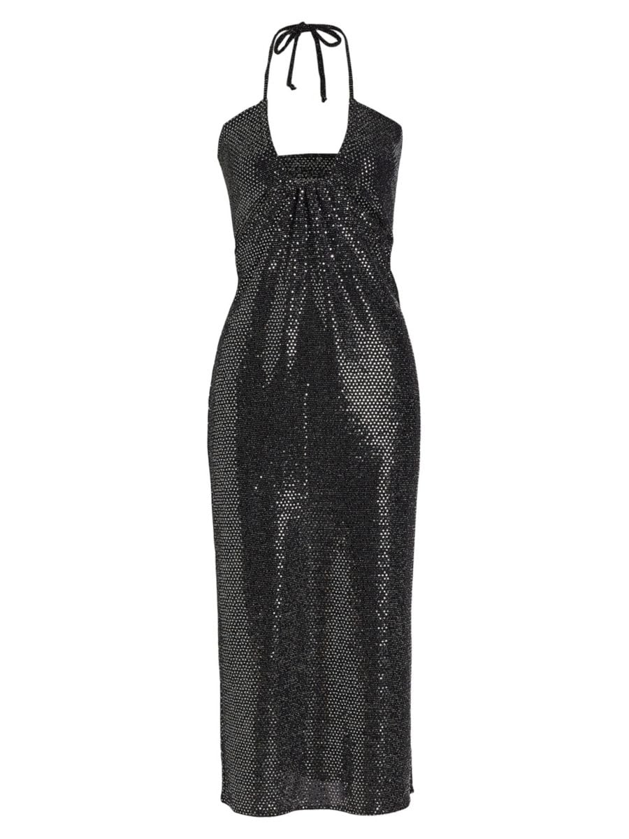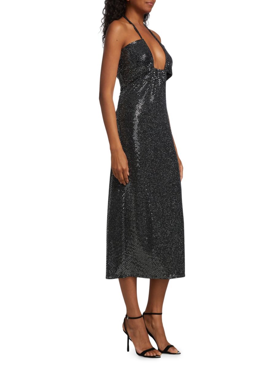 Платье миди Tal без рукавов от Dodo Bar Or украшено глубоким геометрическим V-образным вырезом и мерцающей вышивкой из пайеток.