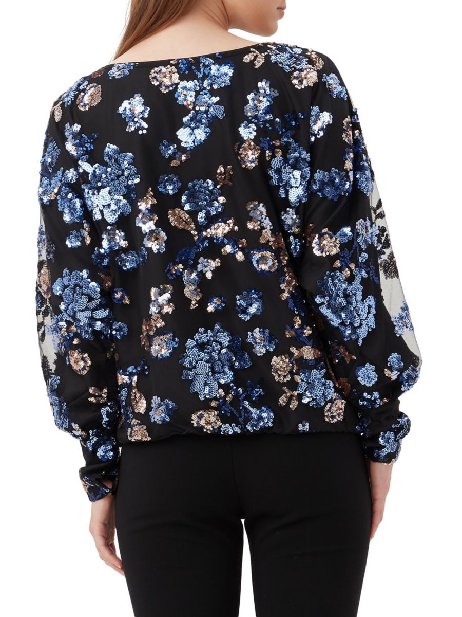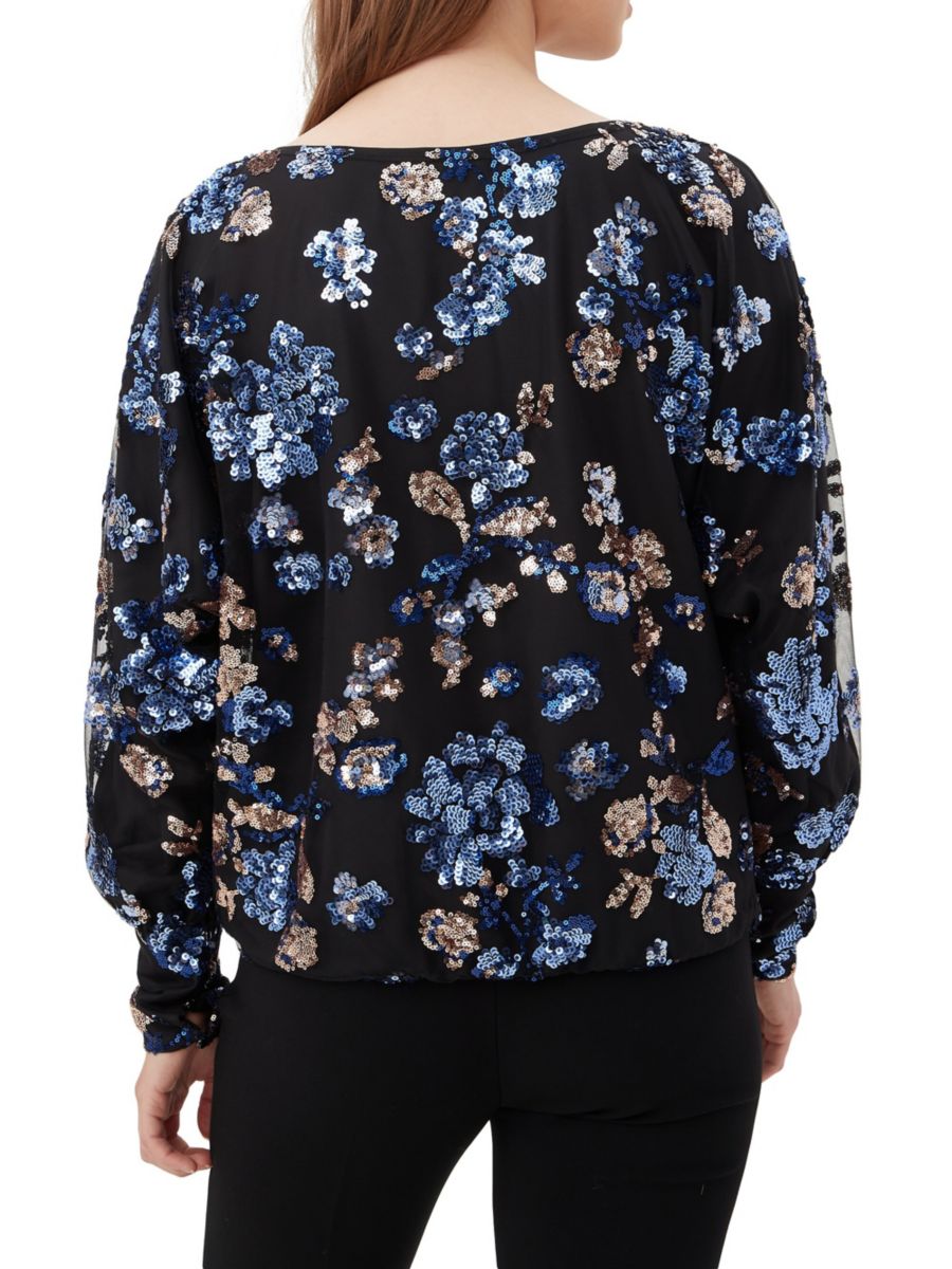 Топ Sprite от Trina Turk, сверкающий пайетками, имеет длинные рукава летучая мышь и элегантный вырез лодочка.