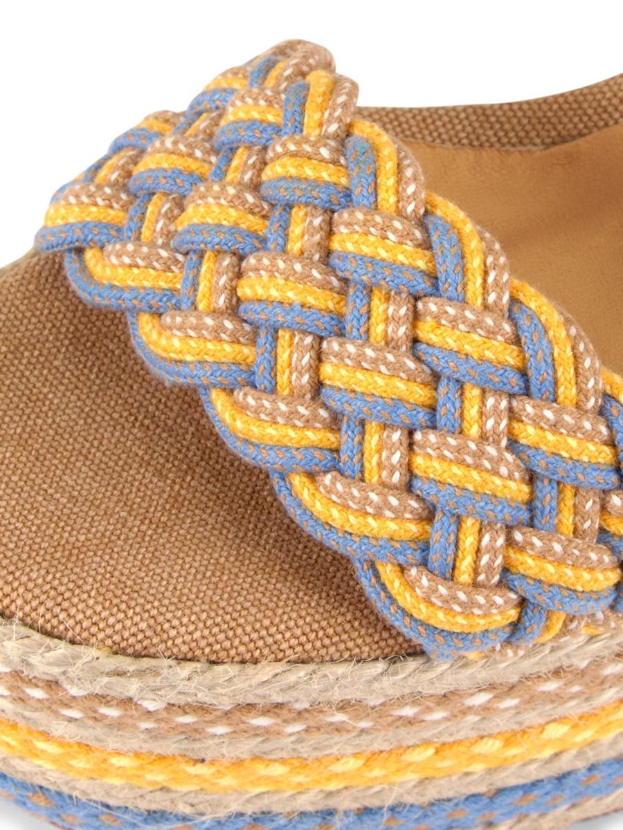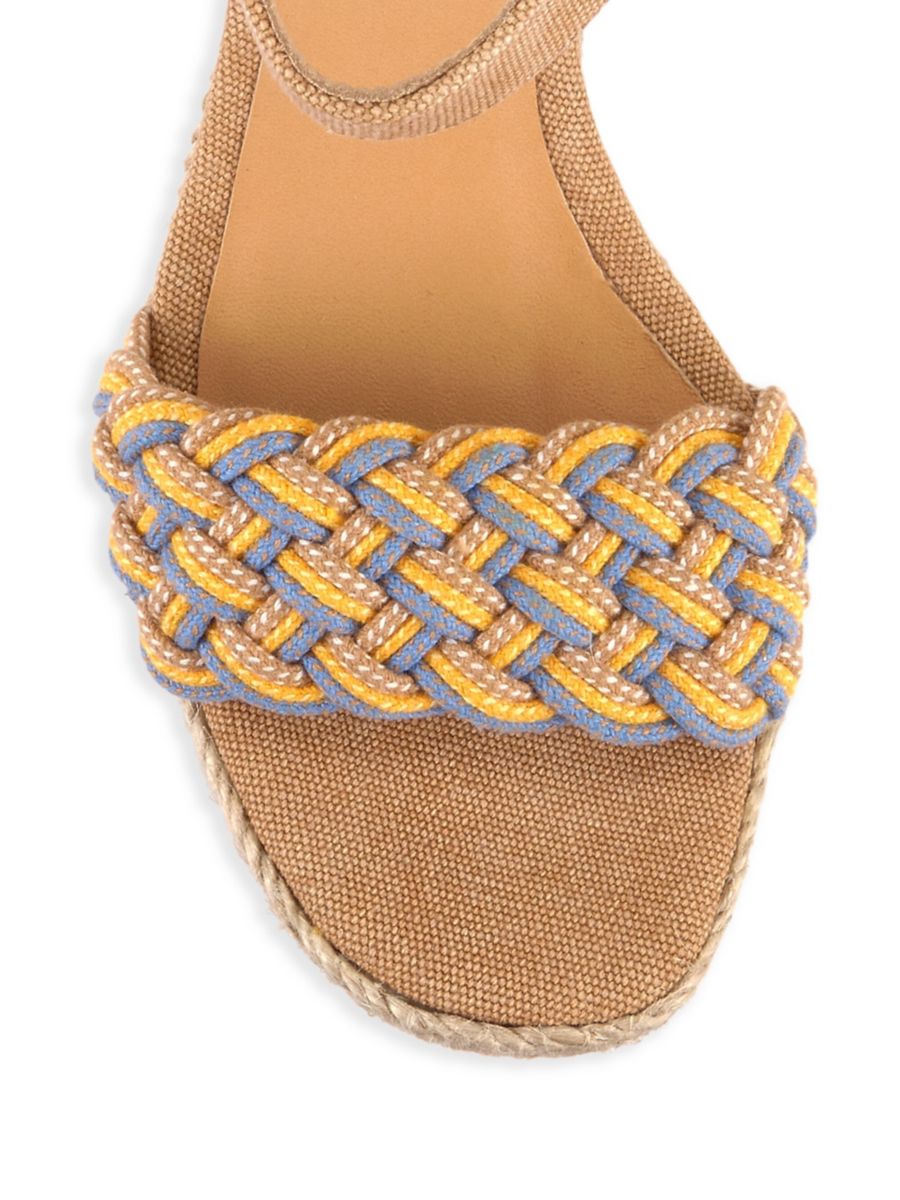 Туфли Anne от Castañer, изготовленные из плетеной рафии, отличаются массивным блочным каблуком с полосатым узором и плетеной деталью на мыске.