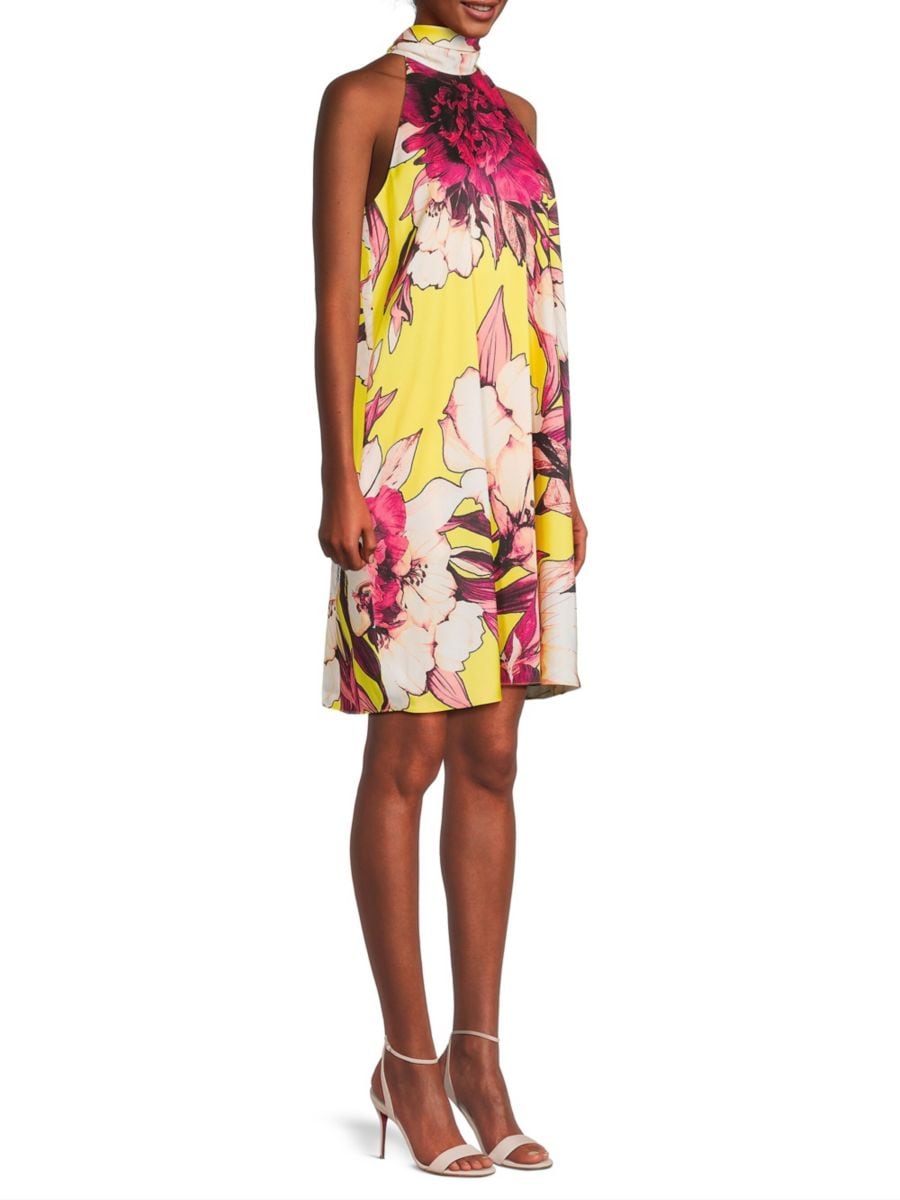 Это платье Zoey длиной до колена от Ungaro украшено цветочным принтом и дополнено халтером и завязкой.