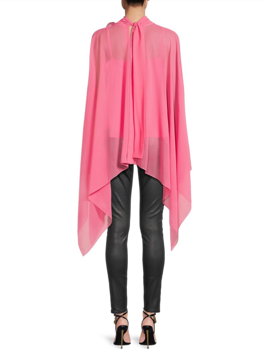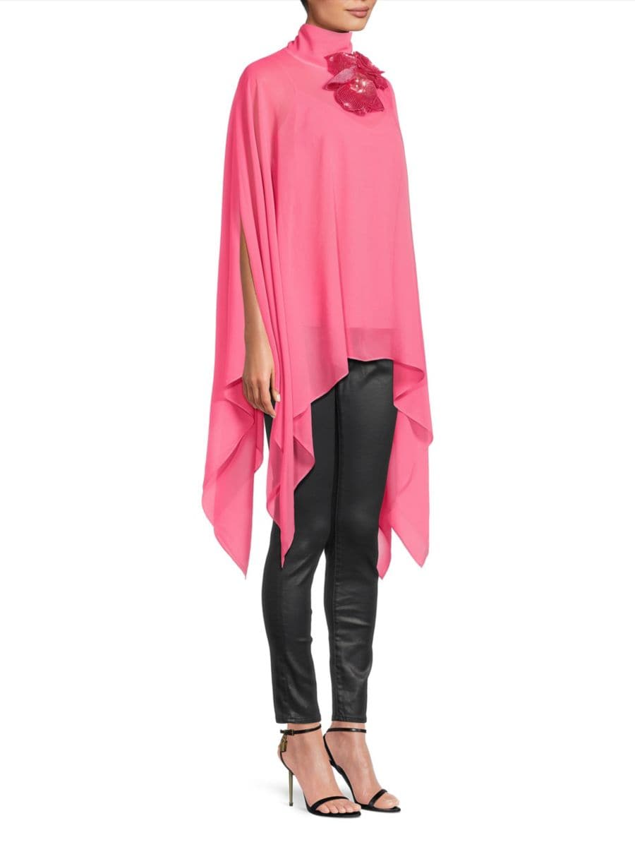 Блузка-кейп Ava от Ungaro, выполненная из шифонового шелка, отличается воротником-стойкой, драпированными рукавами-кейпами и цветочной аппликацией, расшитой пайетками.