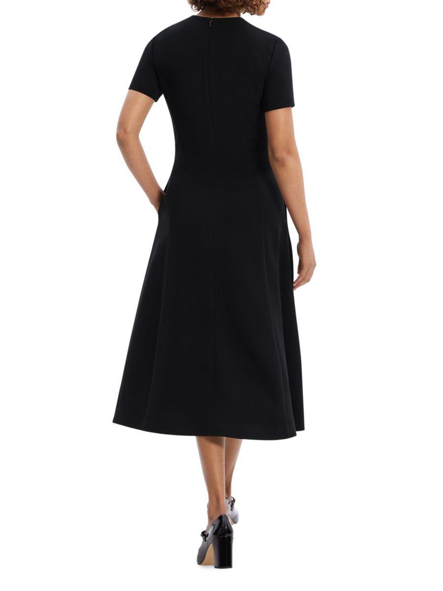 Платье Theory с расклешенным А-силуэтом, облегающим, но свободным кроем на талии, имеет панельный дизайн с круглым вырезом и короткими рукавами.