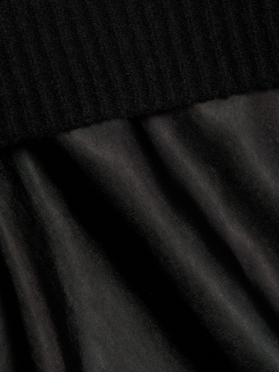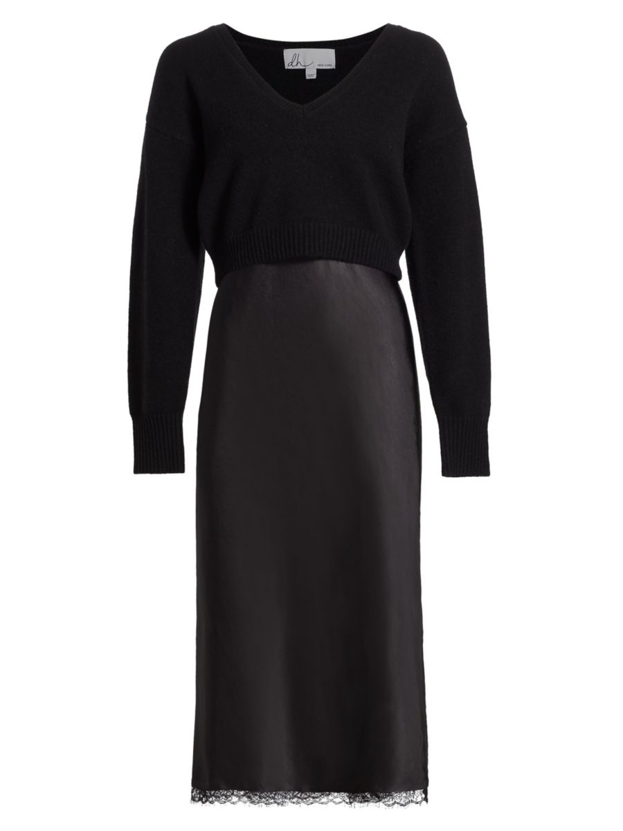 Платье миди Mis от dh New York, выполненное в технике лоскутного кроя, сочетает в себе укороченный свитер с V-образным вырезом и атласную юбку с кружевной отделкой.