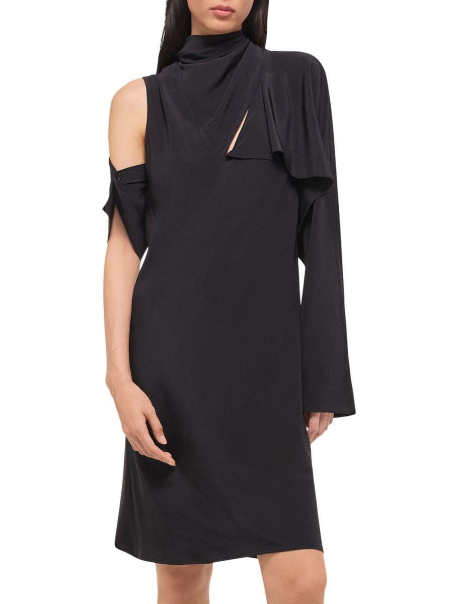 Платье-шарф Helmut Lang, выполненное из шелка, с драпировкой, имеет отложной воротник и отделку воланом для дополнительного ношения.