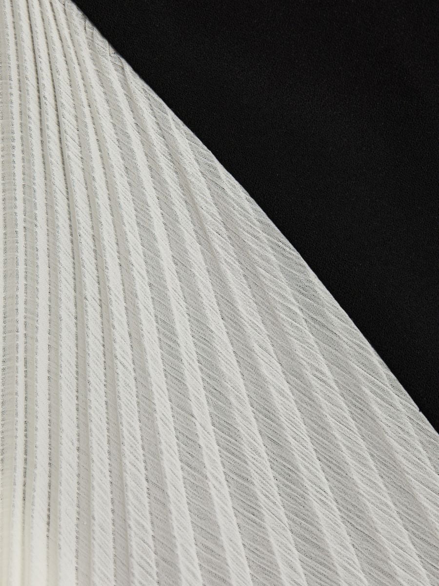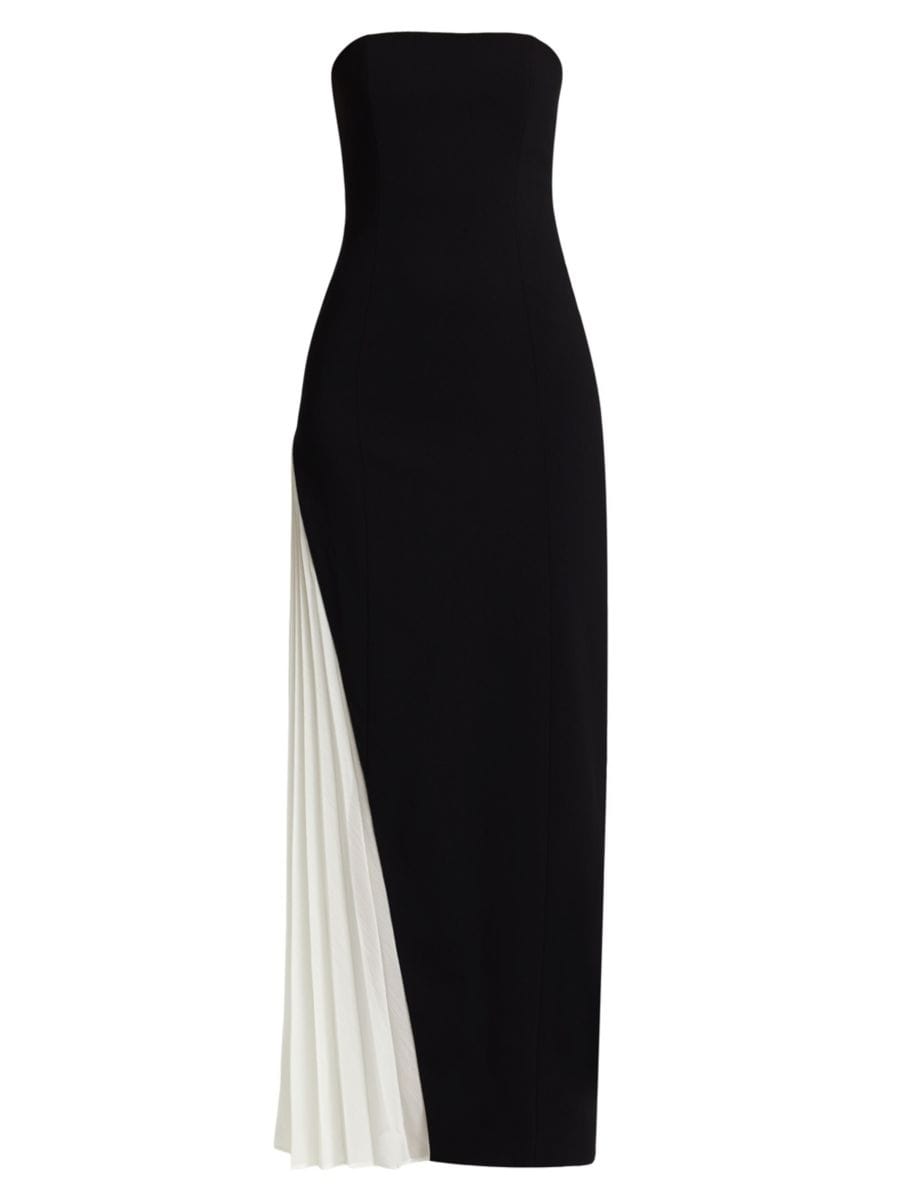 Платье макси Retha от Alice+Olivia подчеркивает прямой вырез, без бретелек и дополнено контрастной плиссированной боковой вставкой годе.