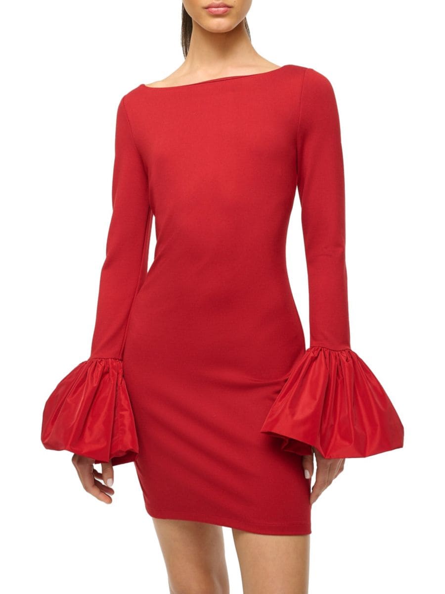 Это мини-платье Hawthorne от Staud выполнено с вырезом лодочка, длинными расклешенными рукавами и застежкой-молнией сзади.