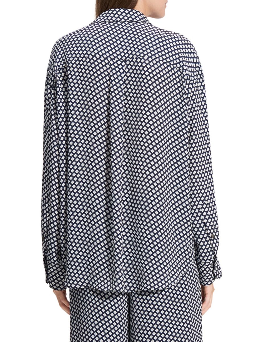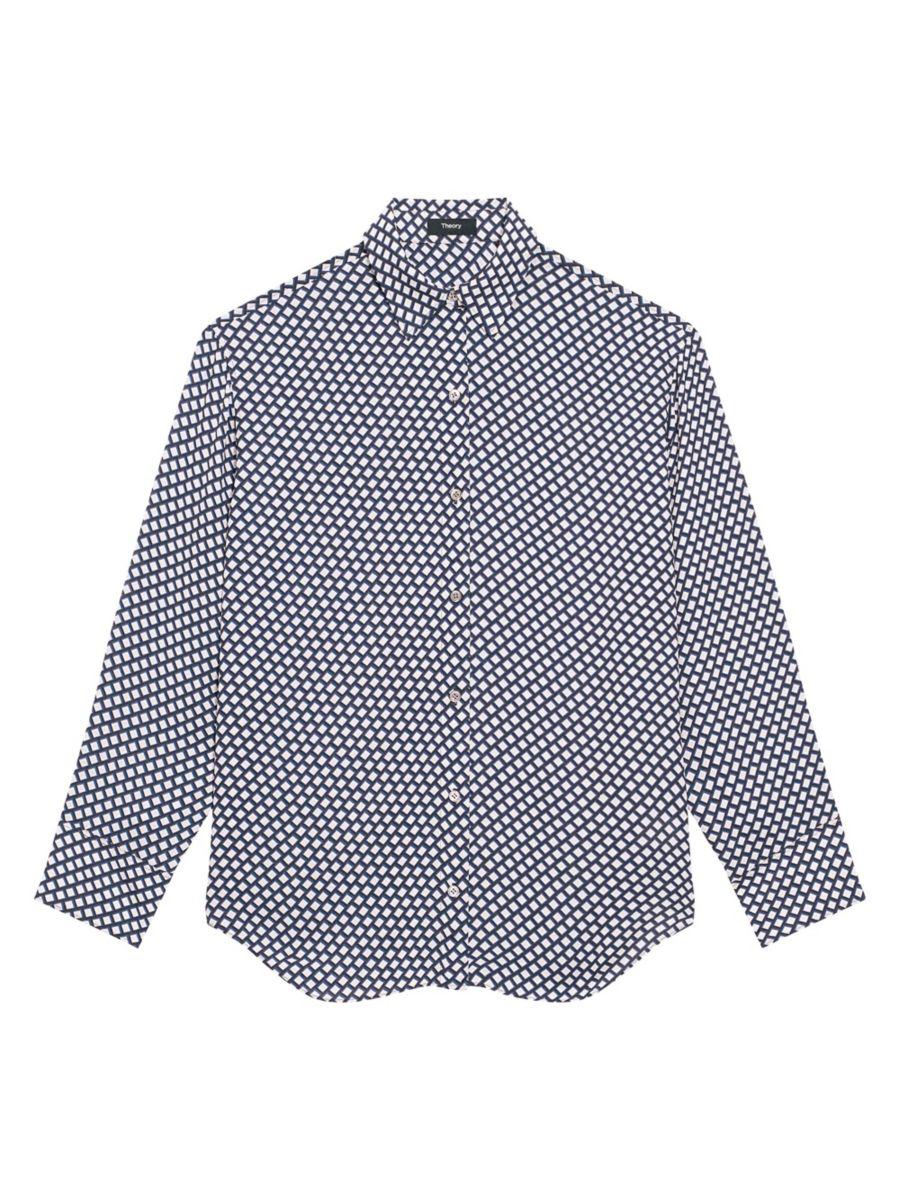 Рубашка Boyfriend от Theory с геометрическим принтом в виде блоков имеет классический свободный крой с заостренным воротником, длинными рукавами и застежкой на пуговицы спереди.