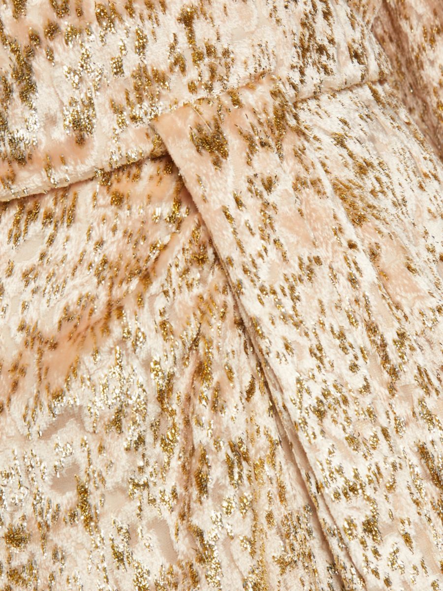 Мини-платье Camryn от SIMKHAI выполнено из металлизированного бархата с абстрактным принтом, вырезом-сюрпризом и драпировкой на талии.