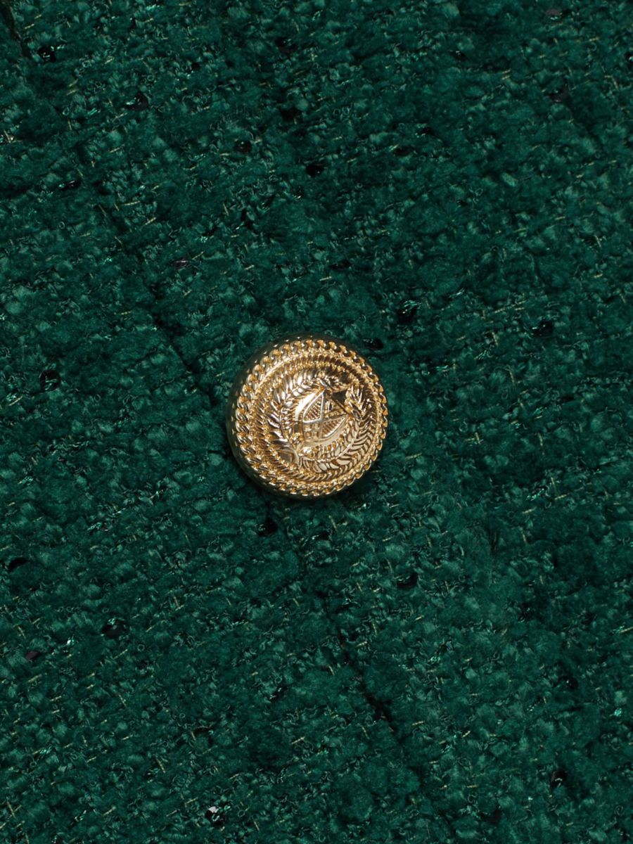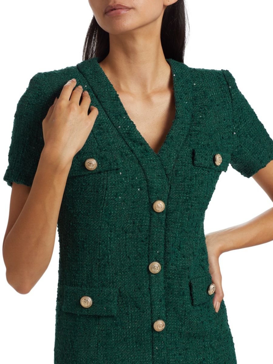 Мини-платье Anne из твида от Generation Love с глубоким V-образным вырезом и золотистыми пуговицами.