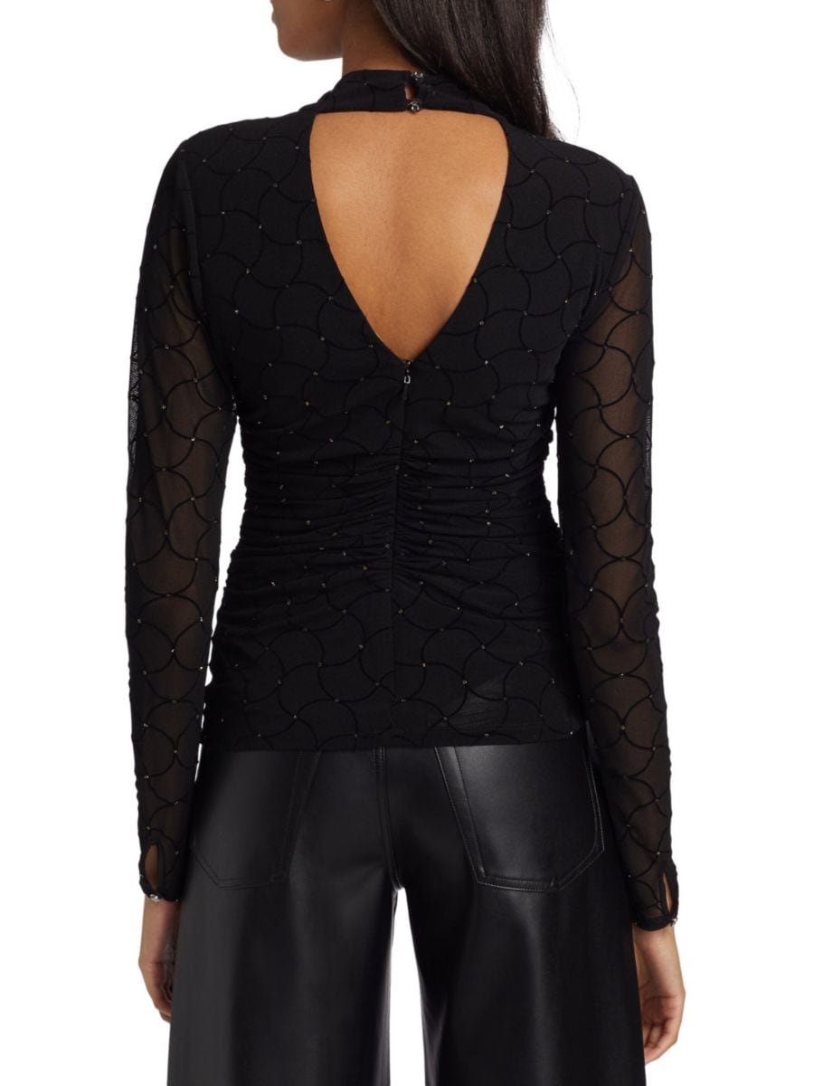 Топ Opal от Ramy Brook с замысловатым сетчатым узором и сверкающими стразами завершает образ соблазнительный V-образный вырез на спине.