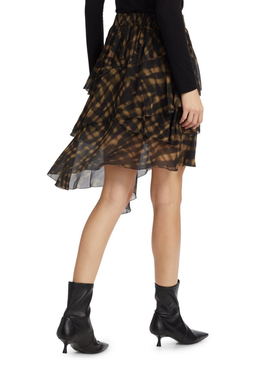 Модель Natalia от Rails отличается асимметричным дизайном с каскадными оборками и принтом в нейтральных тонах, а длина до колена составляет 100%.