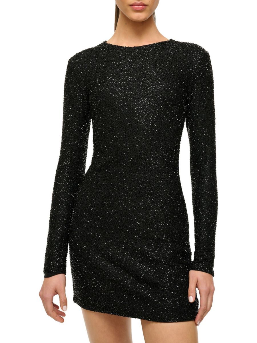 Это мини-платье Paradise с длинными рукавами от Staud имеет облегающий силуэт и украшено стеклянными бусинами.