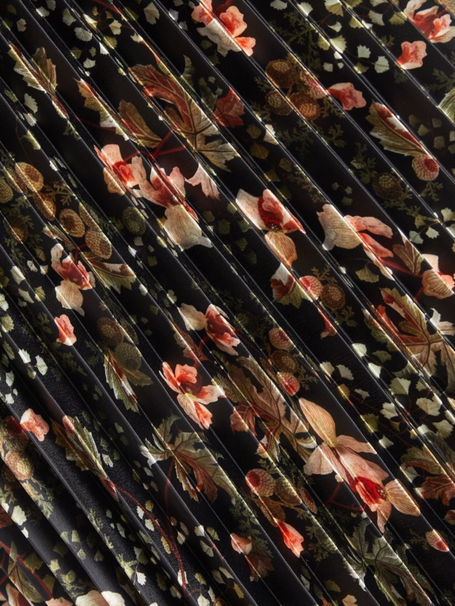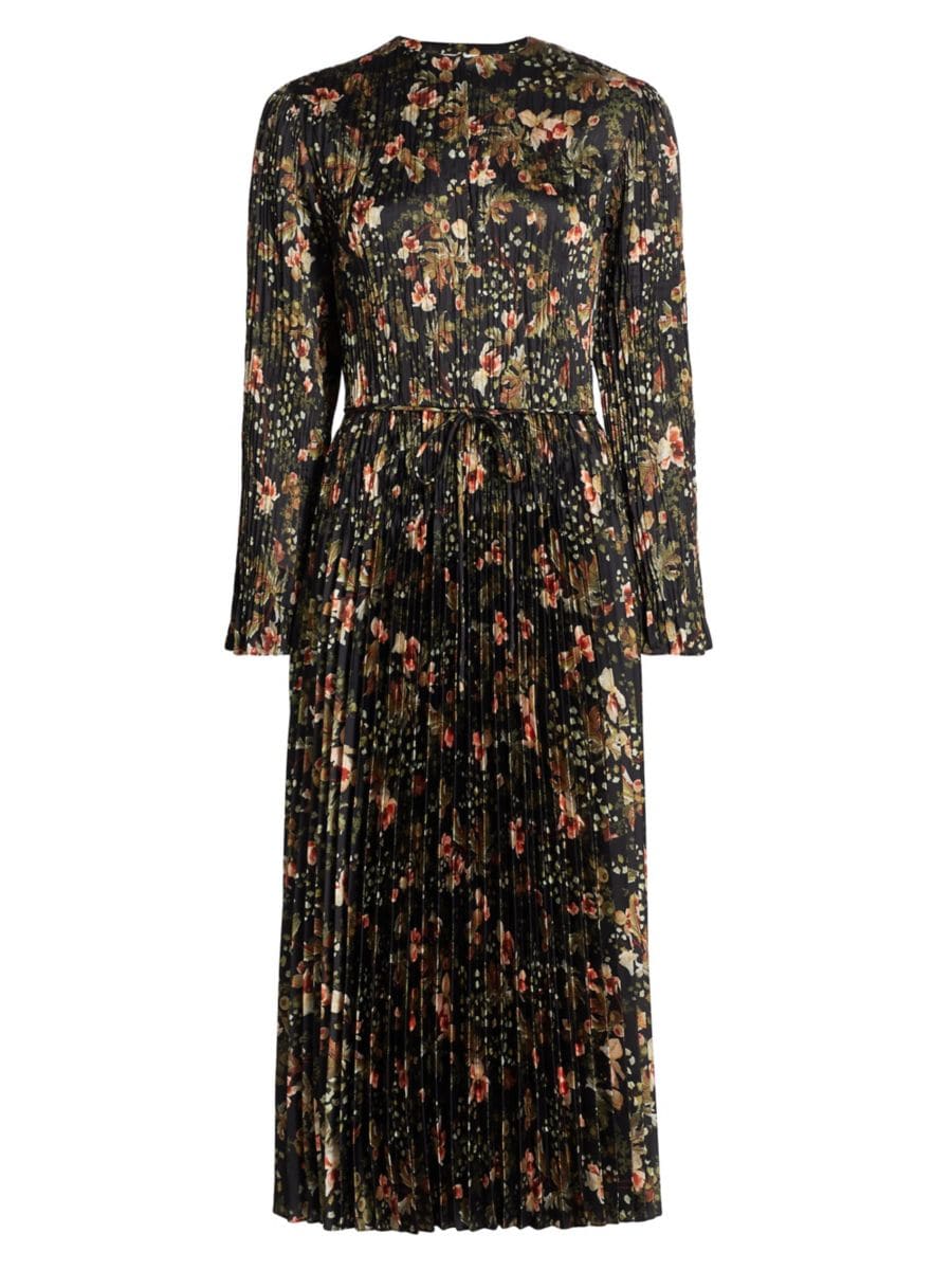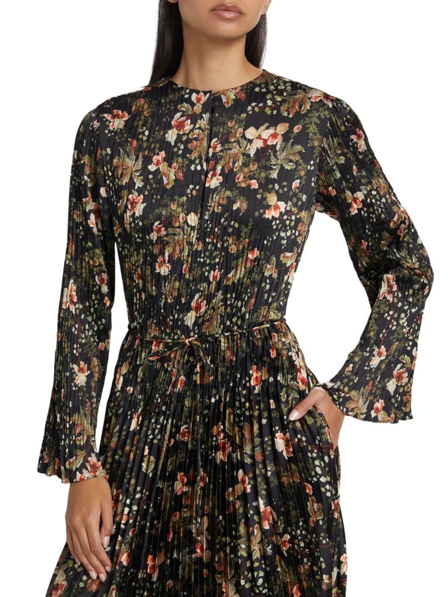 Это плиссированное платье миди Orchid Vine с цветочным принтом от Vince имеет круглый вырез, длинные рукава и завязку на талии.