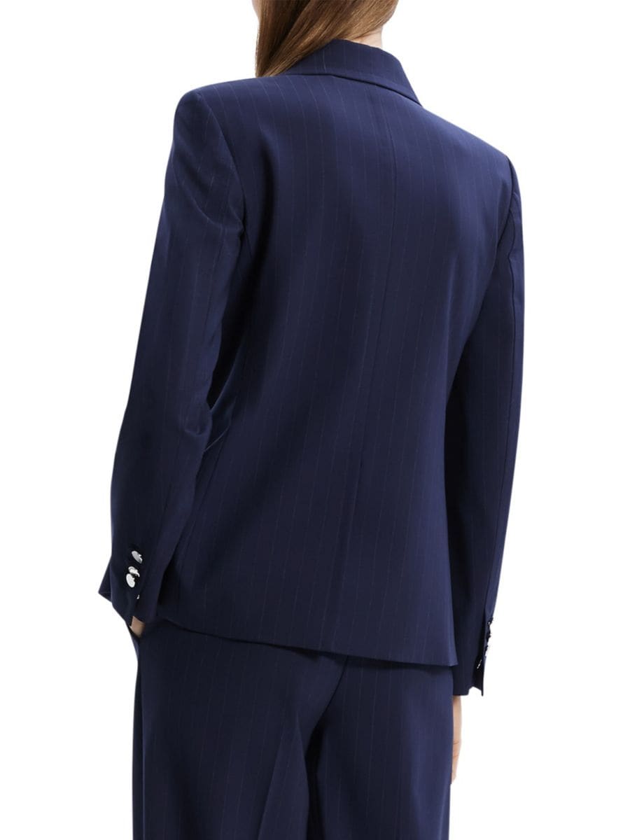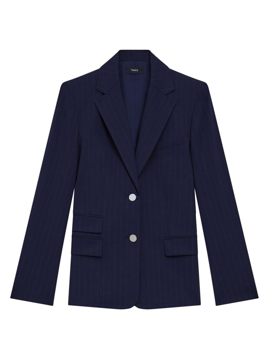 Двухпуговичный пиджак Theory, сшитый из эластичной шерсти в тонкую полоску, имеет традиционные карманы спереди и изысканную шлицу на пуговицах. Застежка на две пуговицы завершает образ.