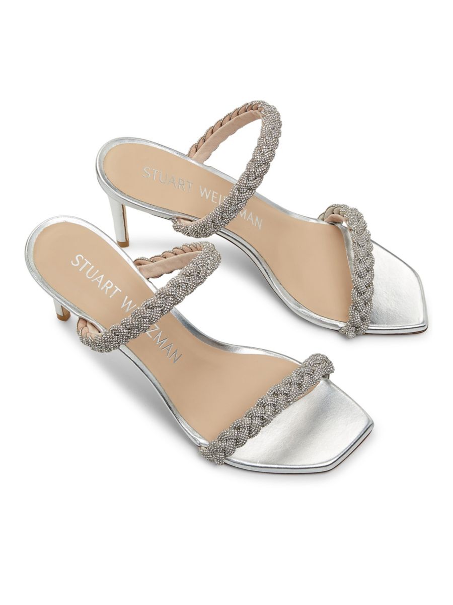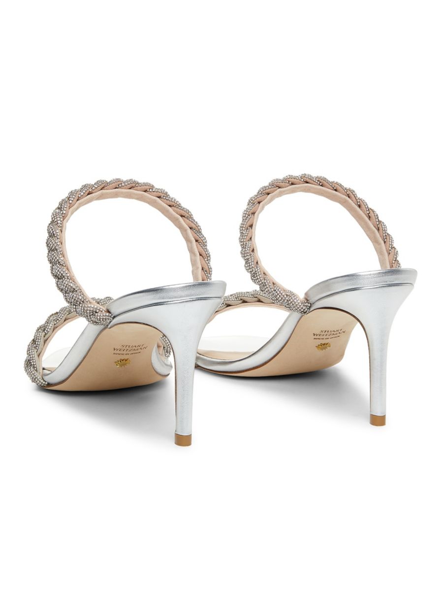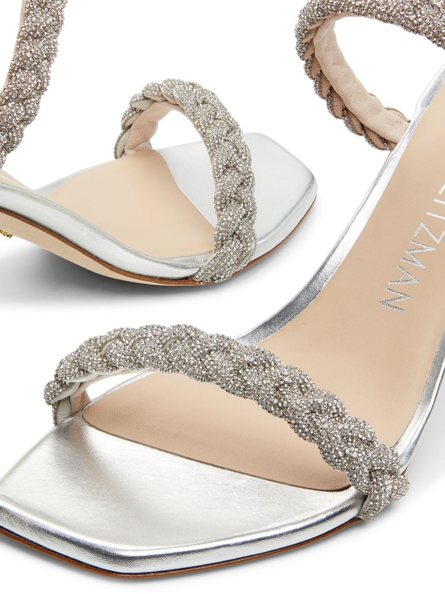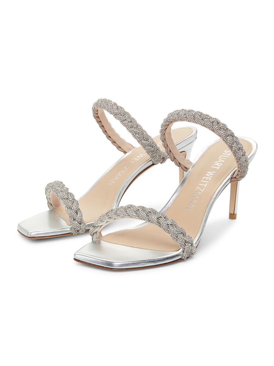 Босоножки Addison от Stuart Weitzman отличаются металлическим дизайном, подчеркнутым двумя ремешками, украшенными стразами. Каблук-шпилька завершает образ.