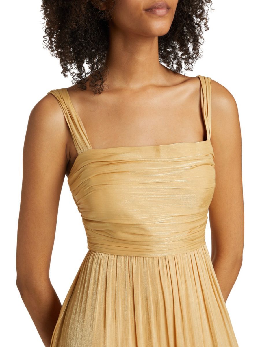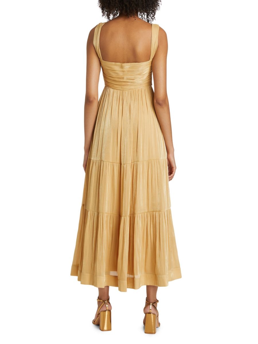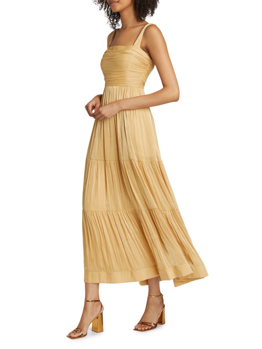 Платье миди Maisie от Kobi Halperin со сборками отличается металлическим блеском и многоярусной юбкой.