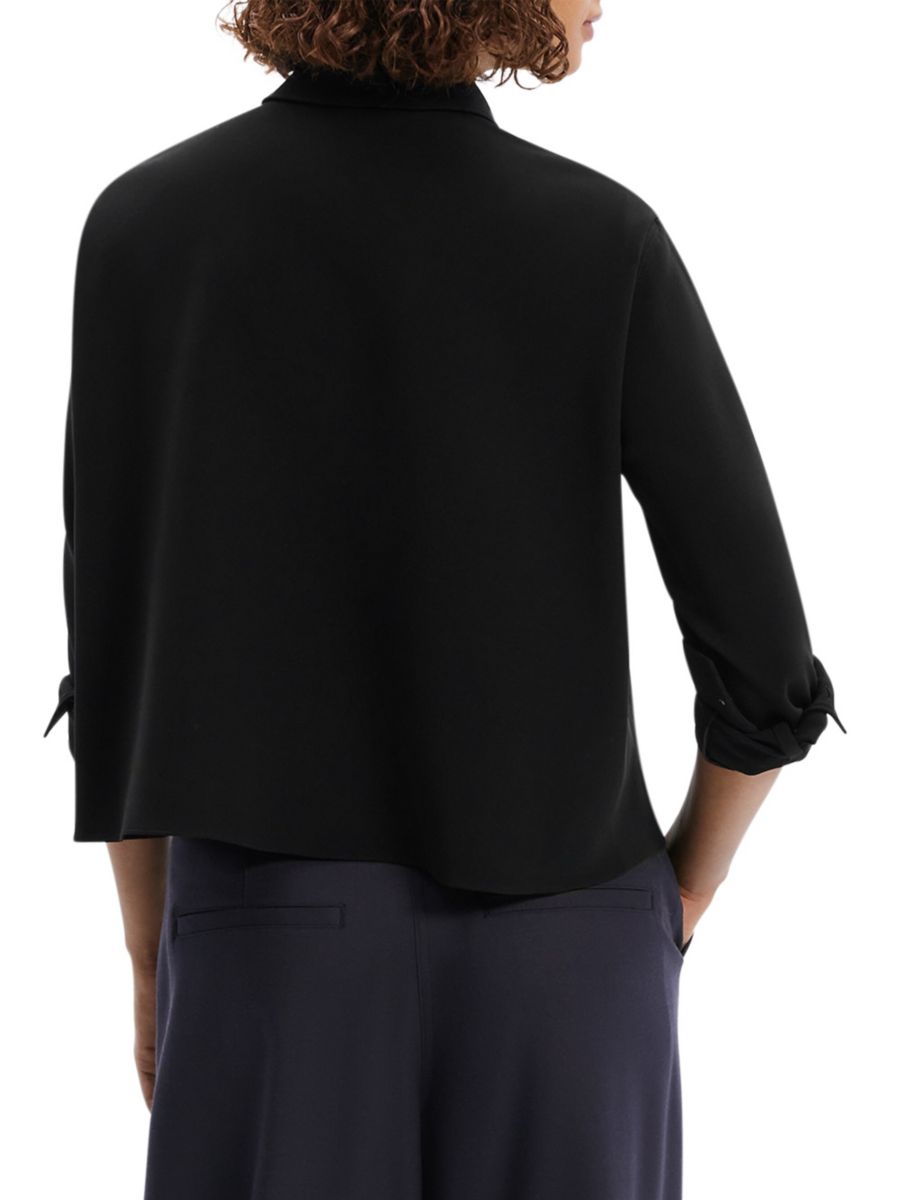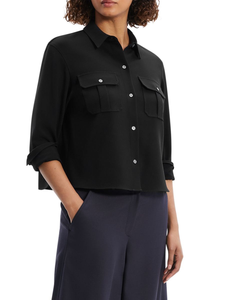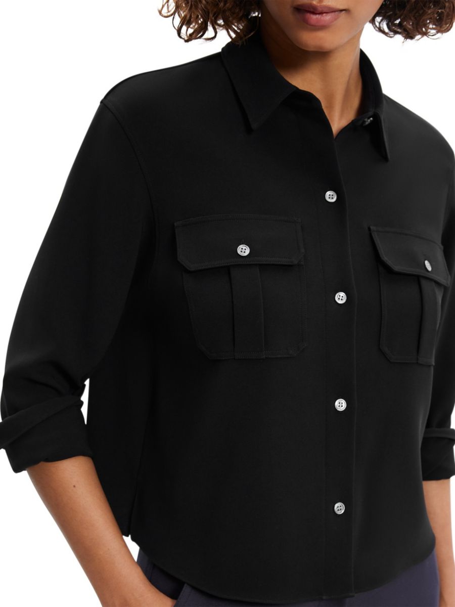 Сочетая в себе утилитарные элементы и современный стиль, укороченная свободная куртка-рубашка с длинными рукавами от Theory отличается нагрудными карманами в стиле милитари и уникальной спинкой-кейпом.