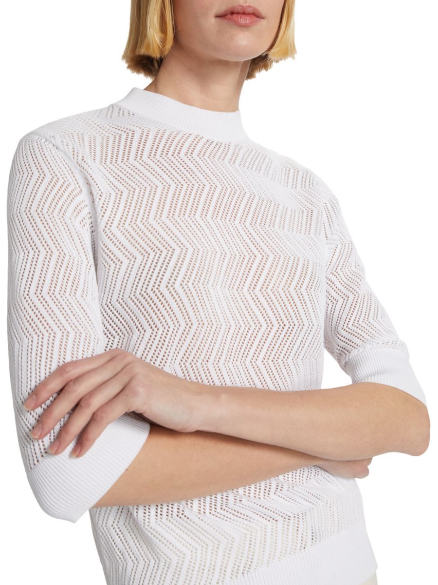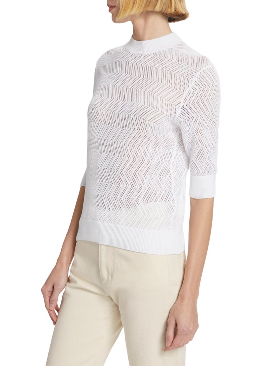 Свитер Nicola от Proenza Schouler выполнен из хлопка ажурной вязки с классическим круглым вырезом и короткими рукавами.