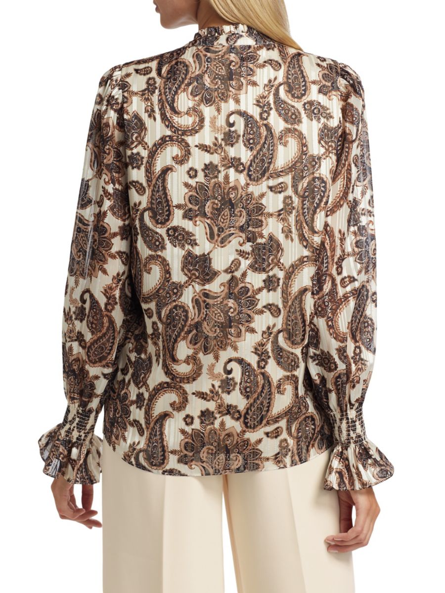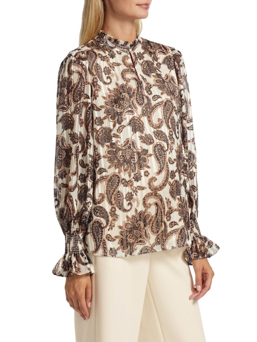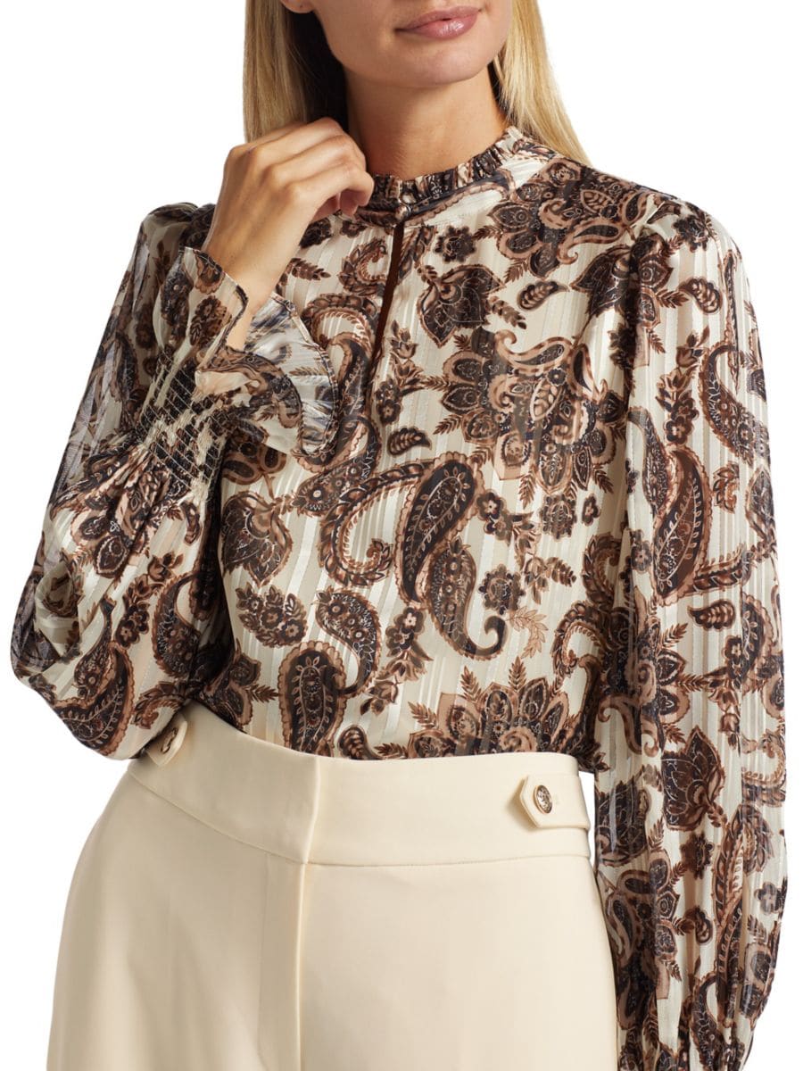 Блузка Jayla от Elle Tahari украшена узором пейсли и оборками на манжетах. Завершает образ вырез-замочная скважина спереди.