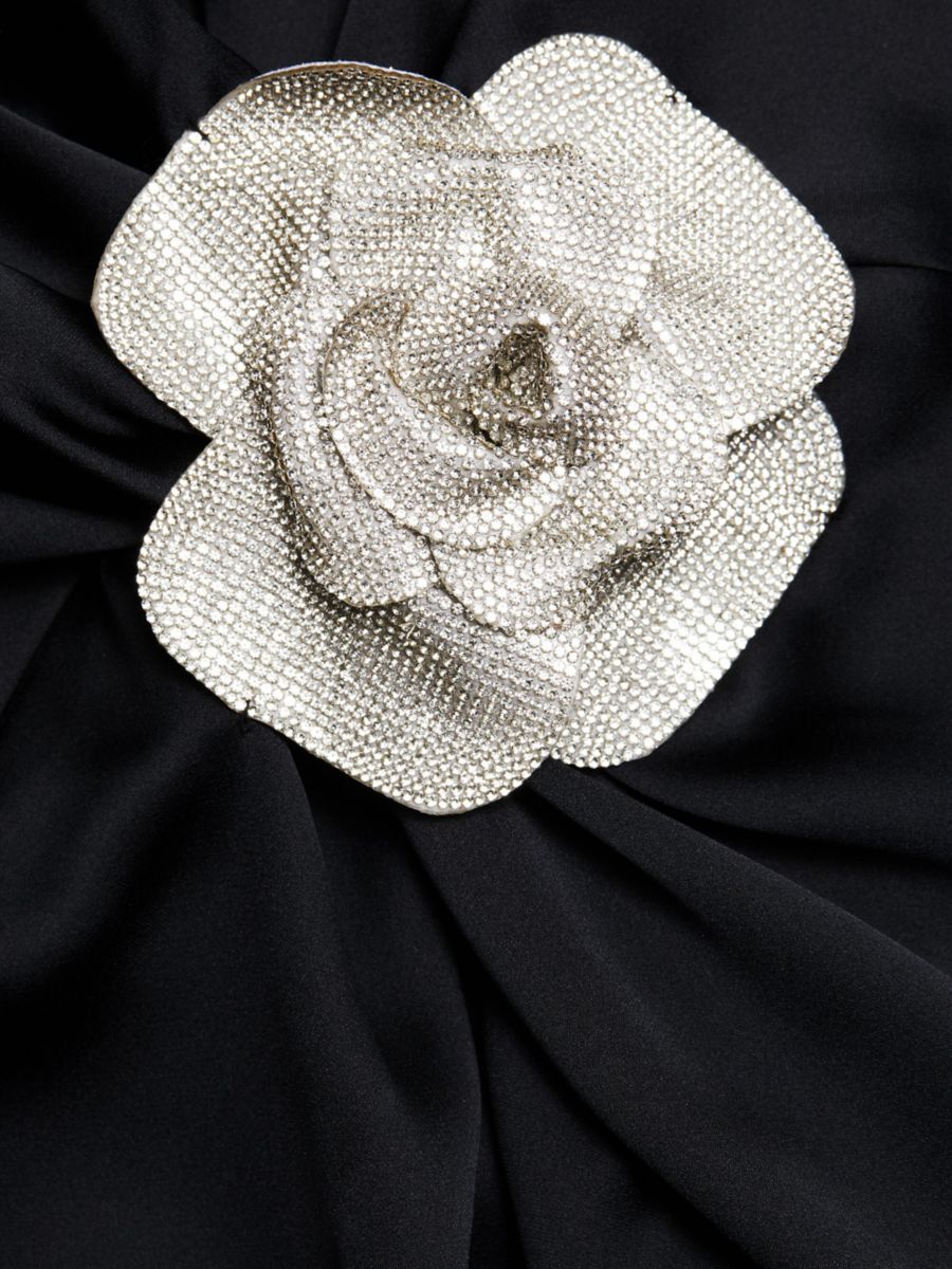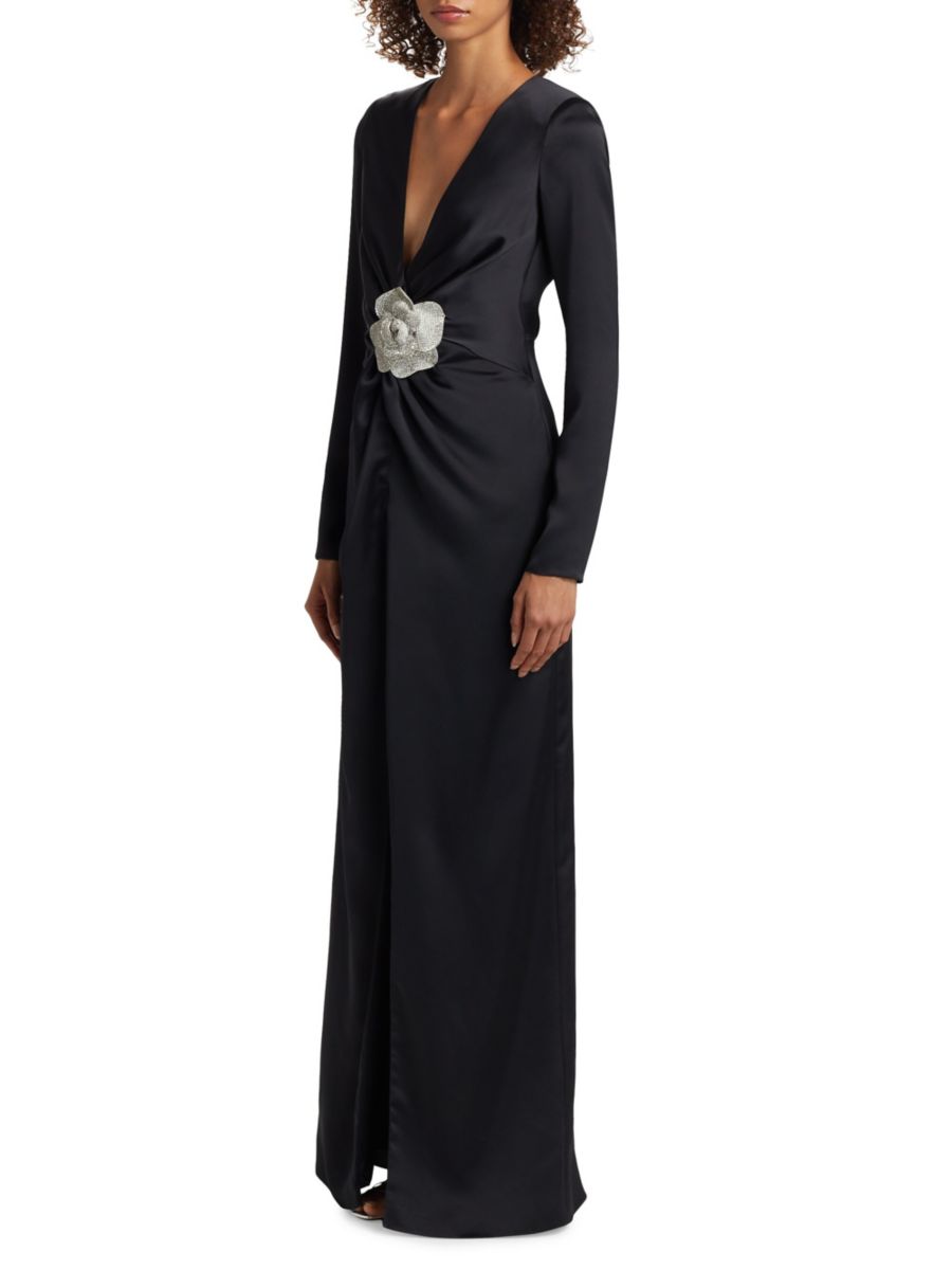 Платье Daryl от Ramy Brook с глубоким V-образным вырезом и разрезом спереди имеет присборенную талию, украшенную цветком, украшенным кристаллами.