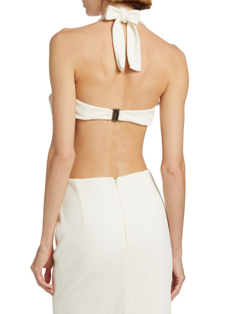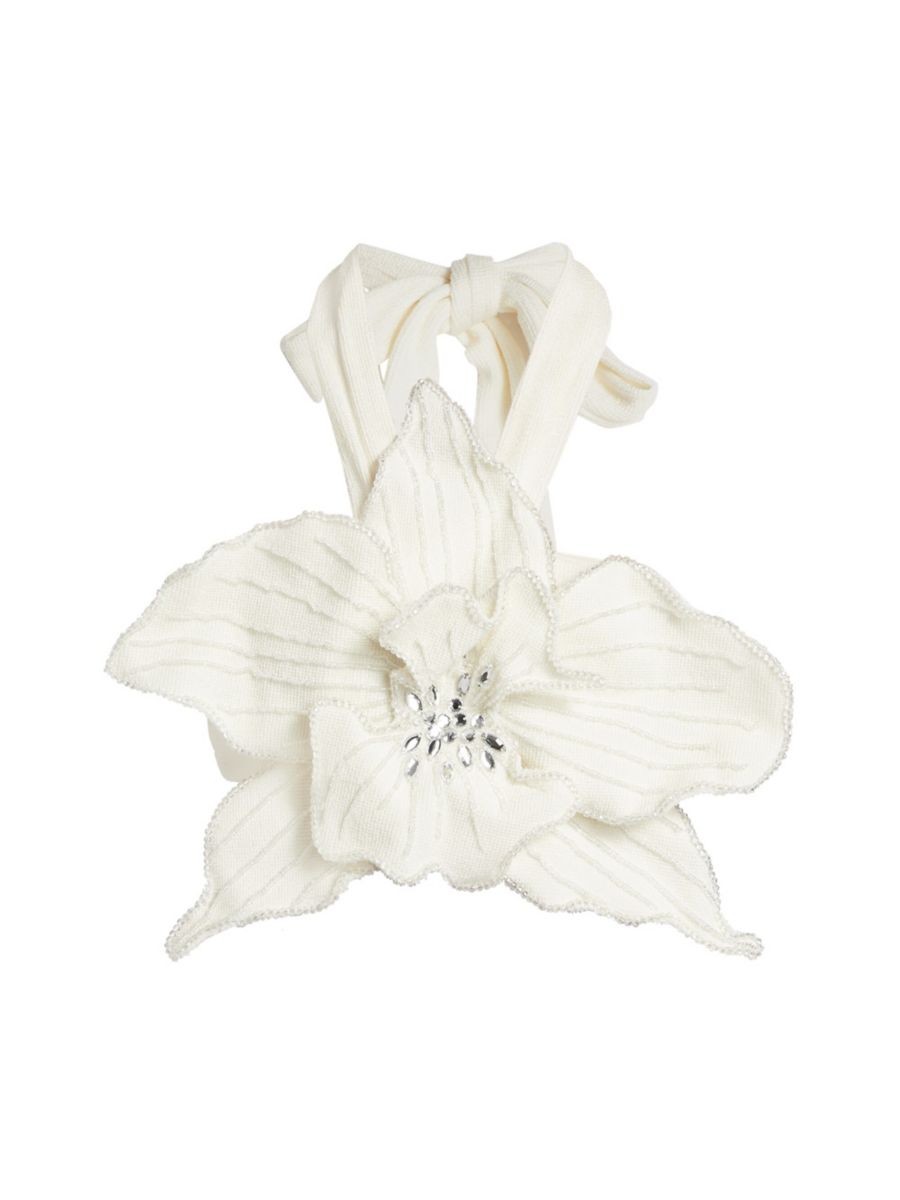 Текстурированный трикотажный укороченный топ PatBO выполнен в форме цветка, напоминающего орхидею, с отделкой бисером и кристаллами.