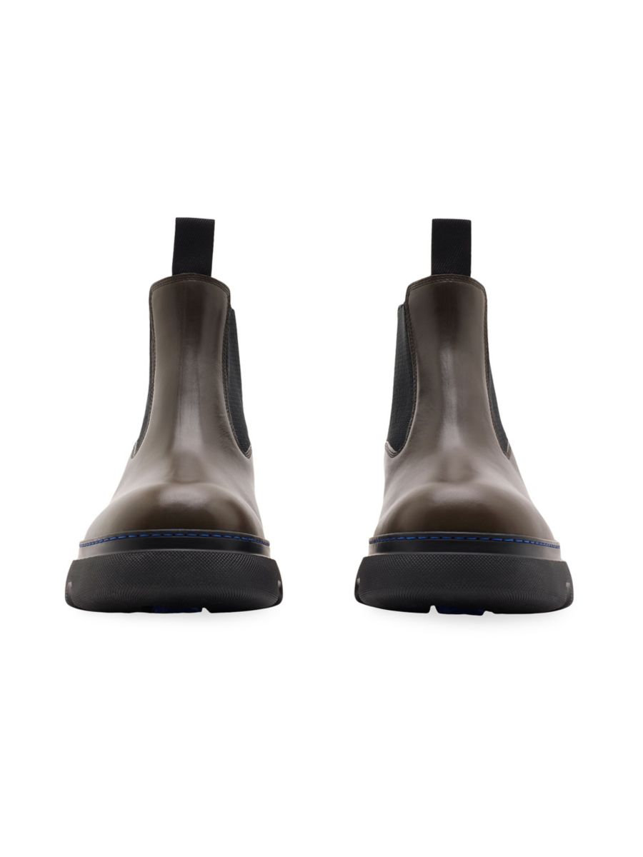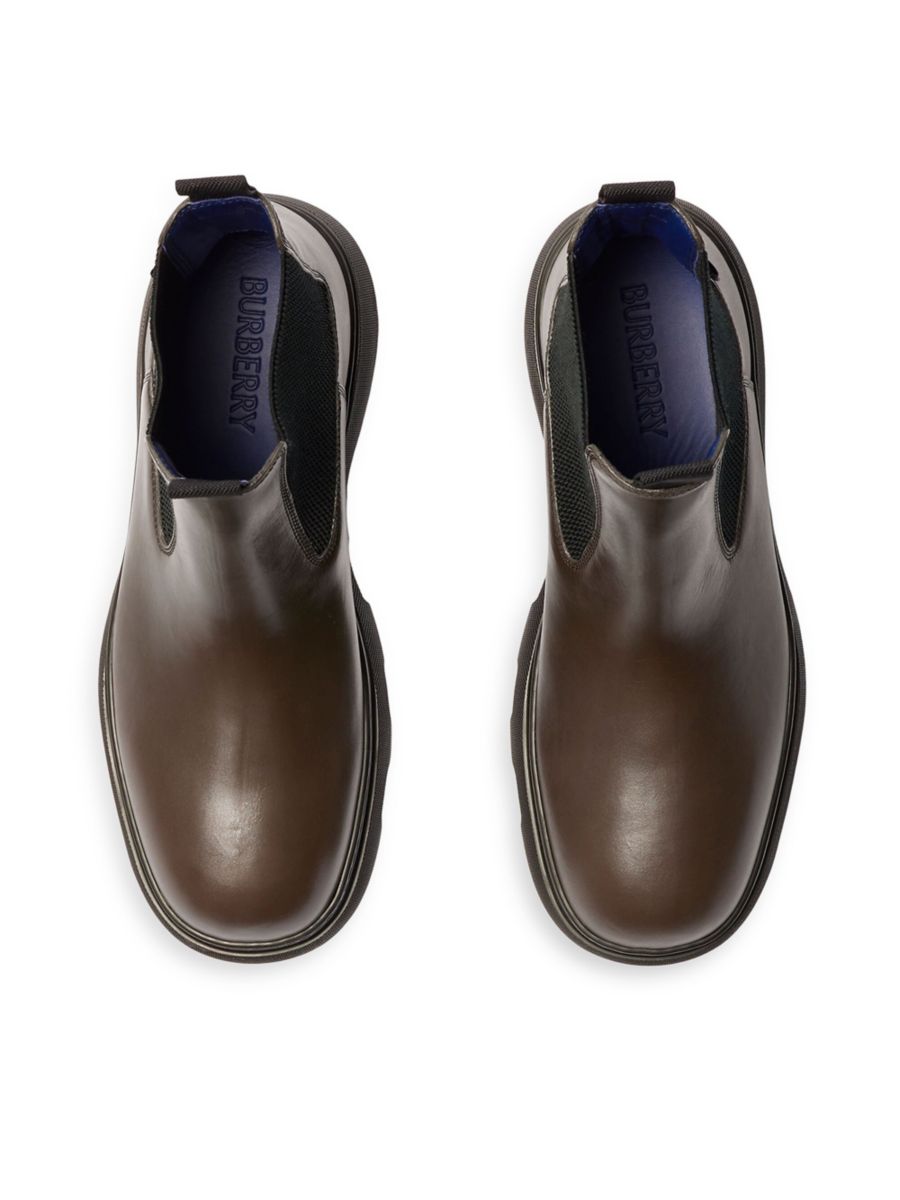 Ботинки челси Mini Creeper от Burberry, изготовленные в Италии, изготовлены из шлифованной кожи. Модель оснащена массивной резиновой подошвой с архивной надписью Burberry.