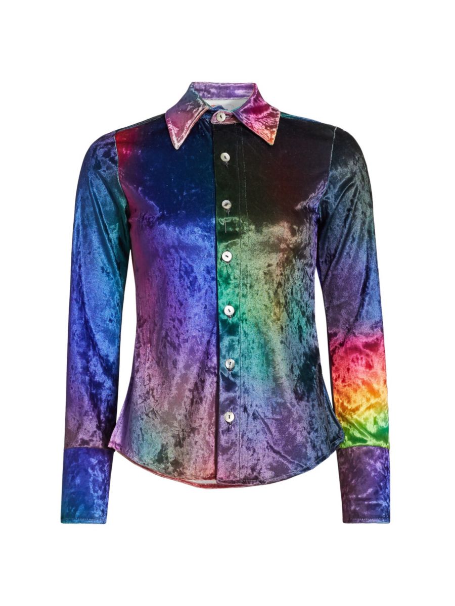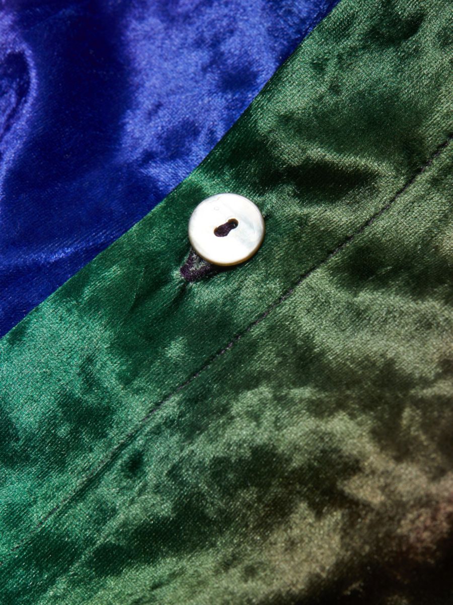 Эффектная рубашка Prism от BruceGlen, изготовленная из жатого эластичного бархата, отличается отложным воротником, длинными рукавами и манжетами на пуговицах.