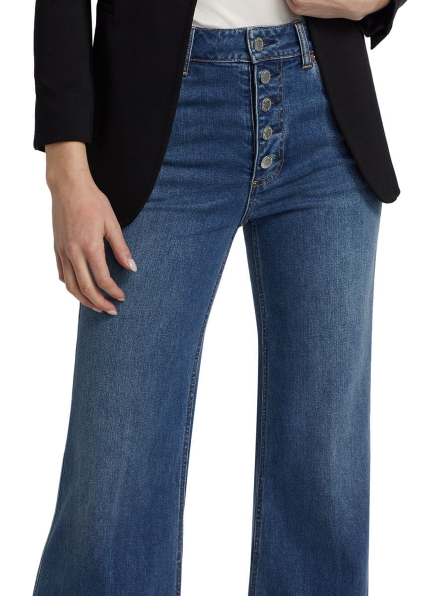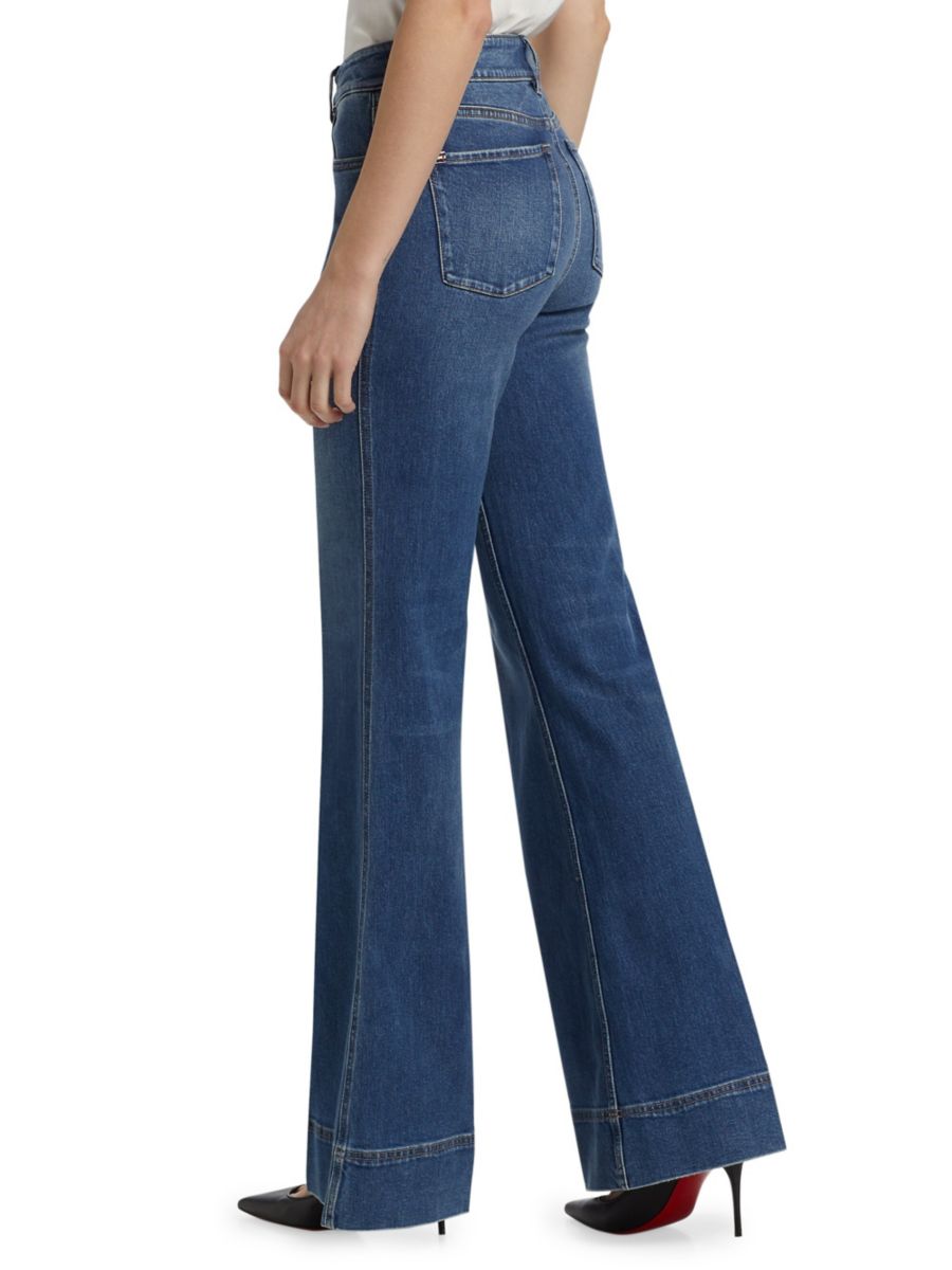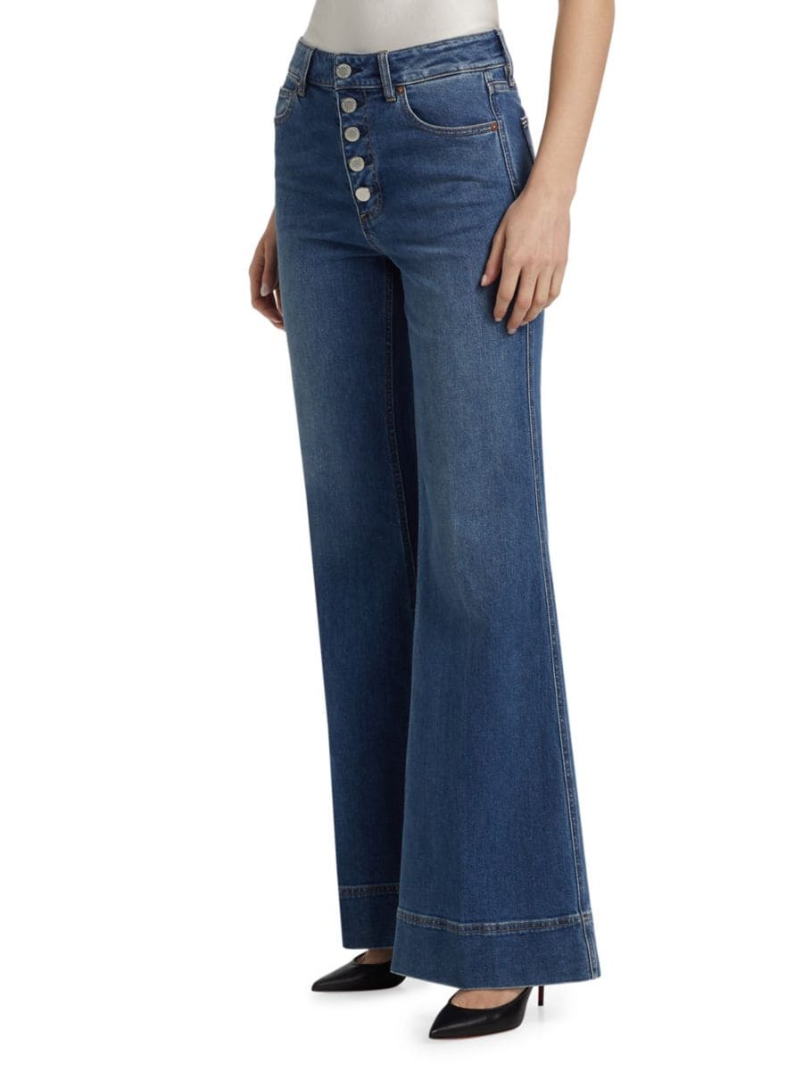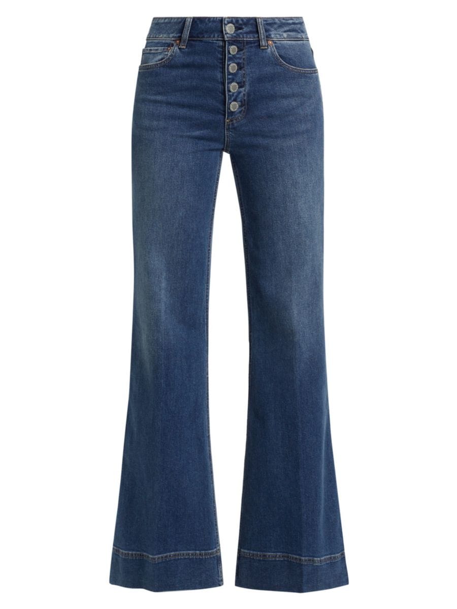 Джинсы Missa от Alice + Olivia, изготовленные из эластичного денима, имеют расклешенный силуэт, дополненный пятью карманами и открытой гульфиковой застежкой на пуговицах.