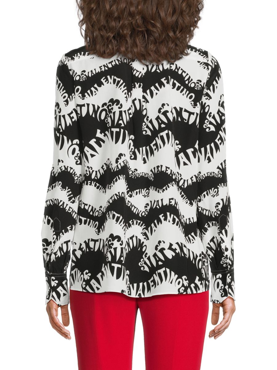 Эта рубашка от Valentino выполнена из роскошного шелка и украшена монограммным принтом по всей поверхности, завязывающимся воротом и отложным воротником.