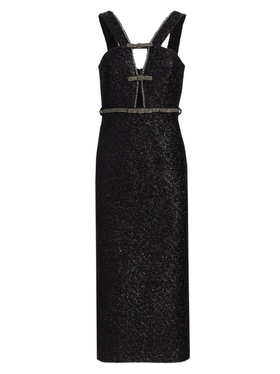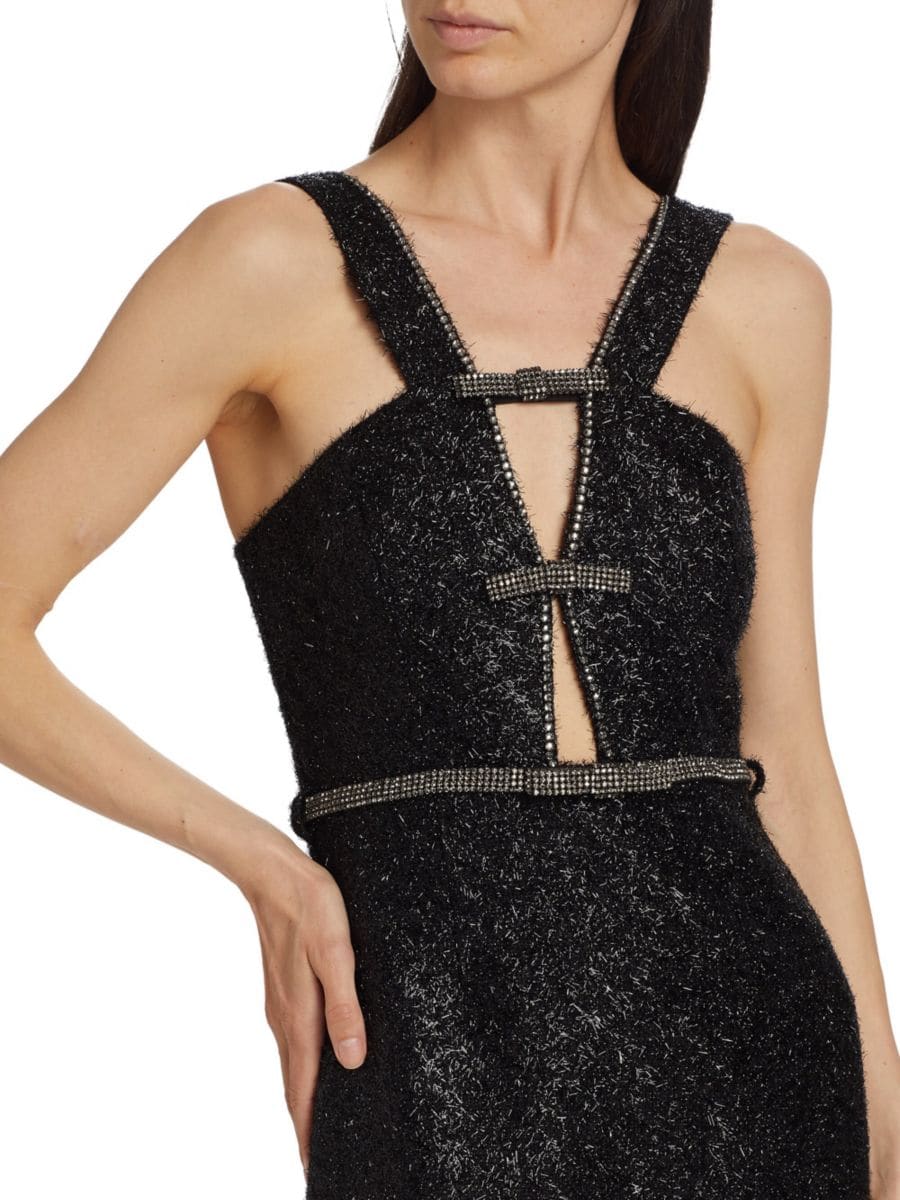Это ослепительное платье Автопортрет выполнено из мишурного букле, украшено сверкающей отделкой из страз и очаровательными бантами. Дизайн включает в себя яркий вырез и приталенную юбку миди, что создает гламурный и изысканный силуэт.