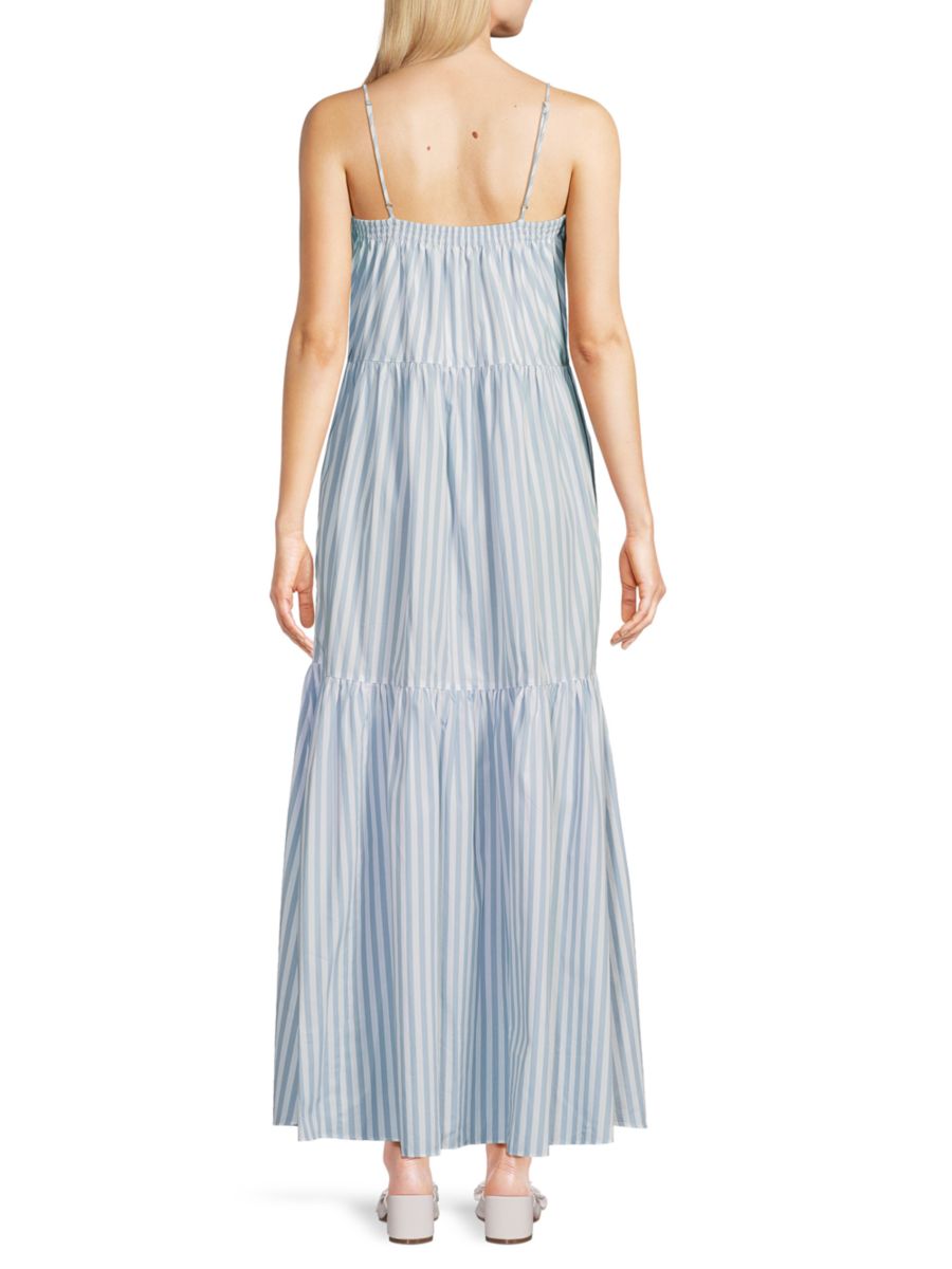 Это легкое хлопковое макси-платье от rag & bone с прямым вырезом, изящными бретельками и мягко собранной многоярусной юбкой в вертикальную полоску.