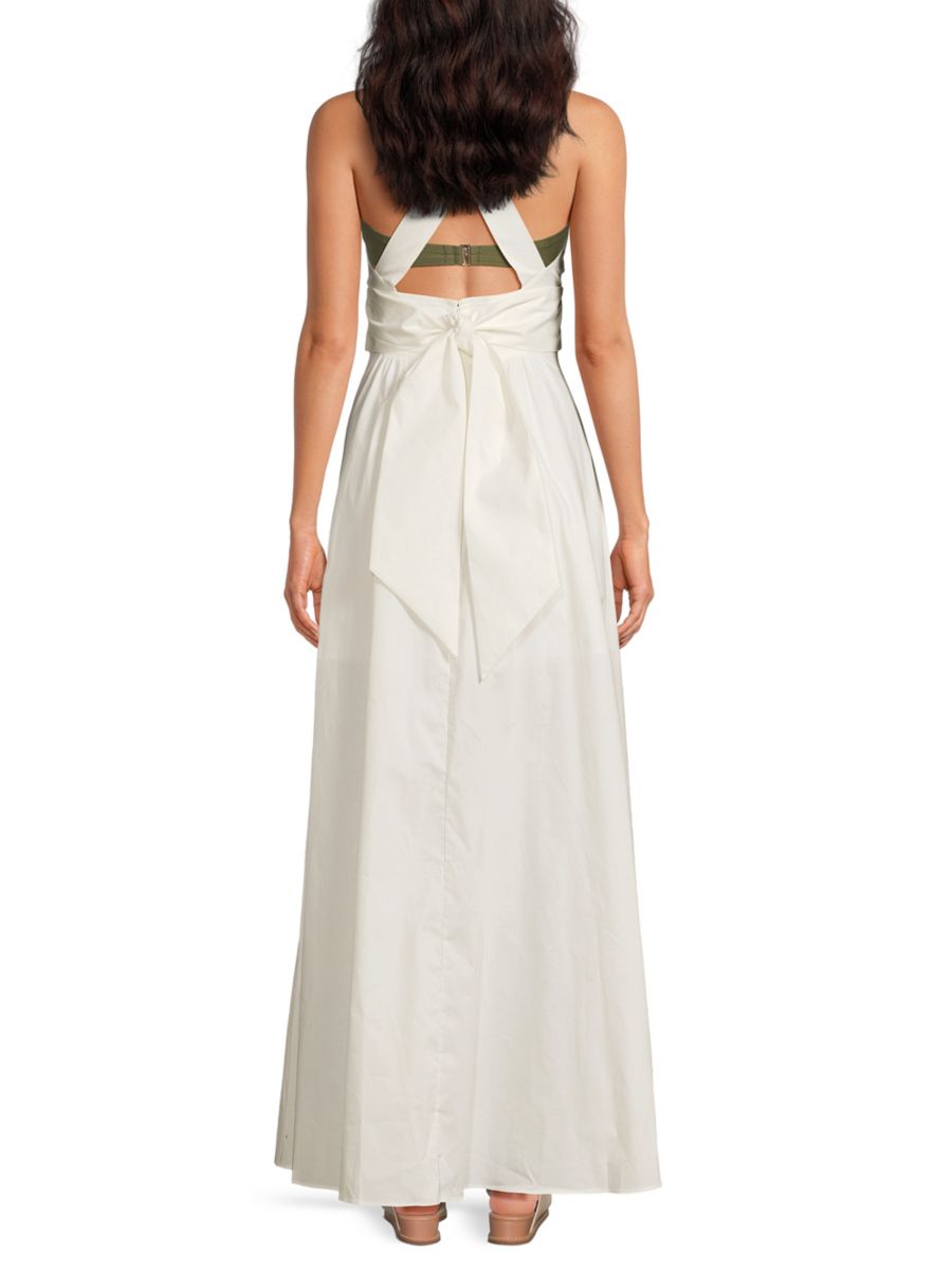 Это приталенное макси-платье от Milly, выполненное из легкой хлопковой смеси, имеет глубокий V-образный вырез и силуэт без рукавов, что создает воздушный, струящийся образ.