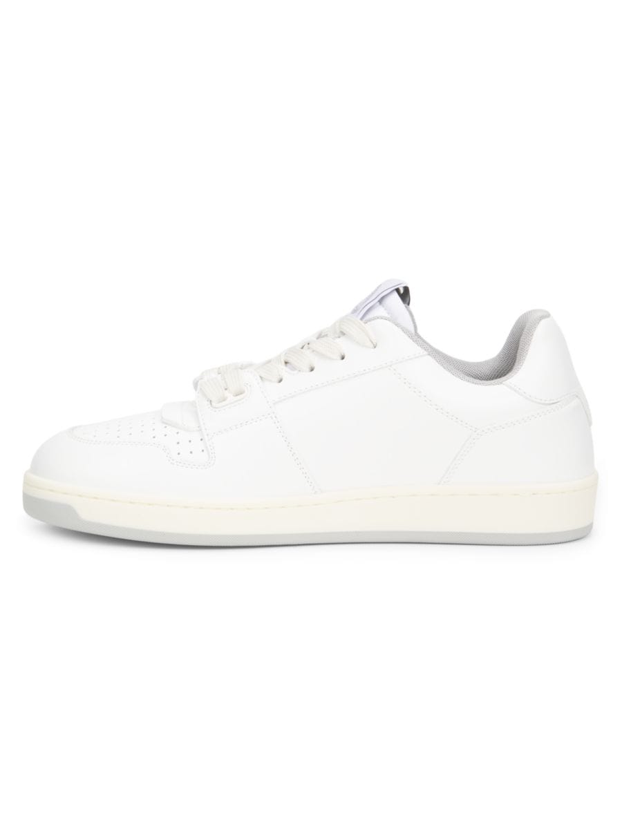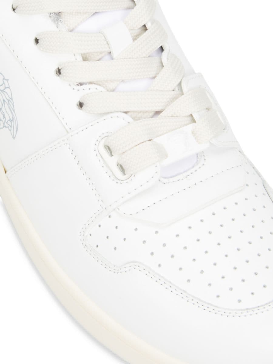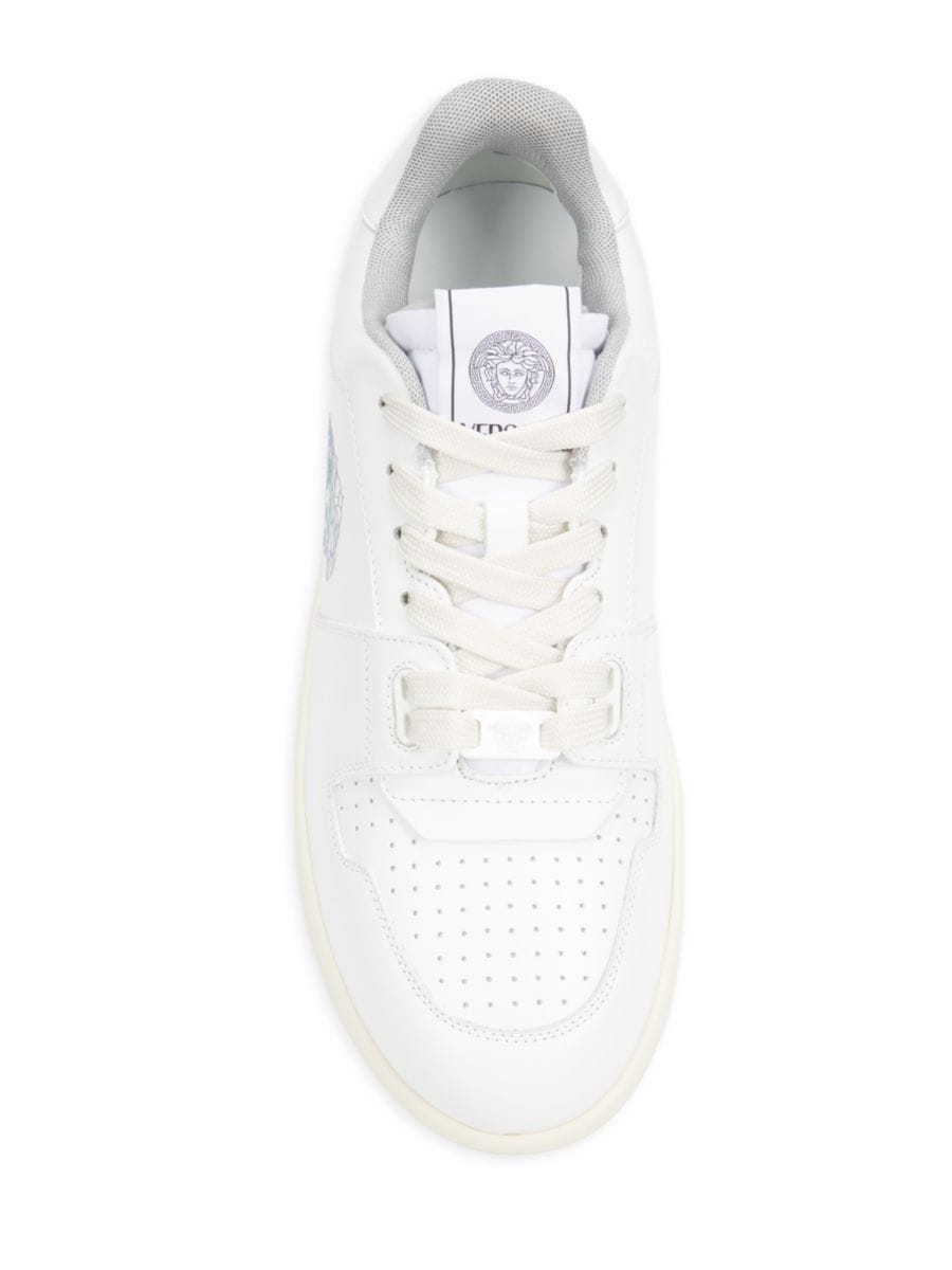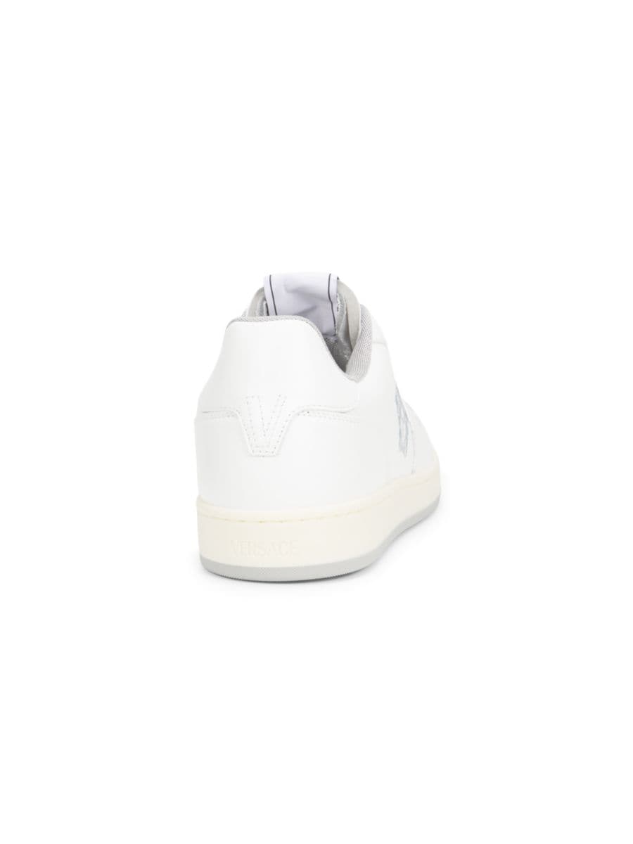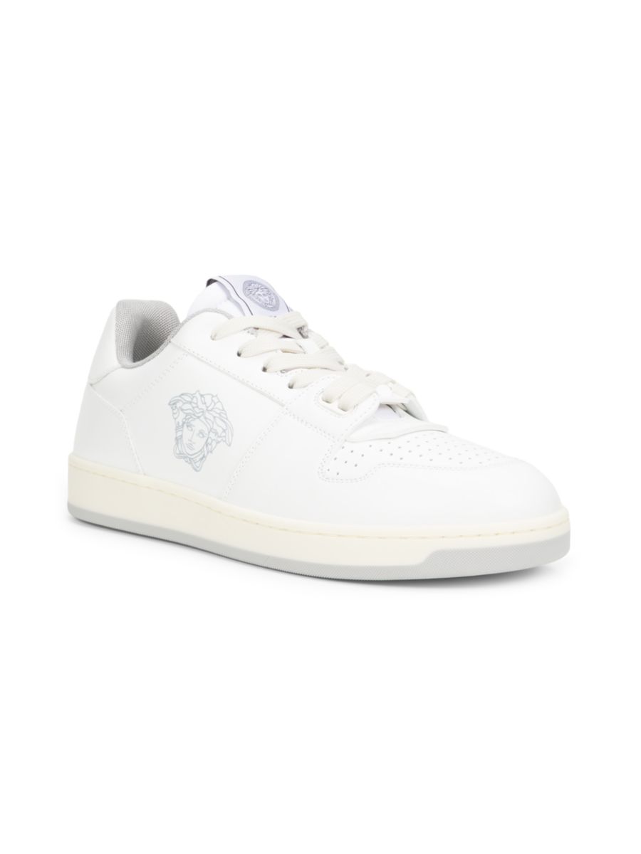 Кроссовки Versace изготовлены из гладкой кожи и имеют классический силуэт с перфорированным носком и логотипом сбоку.