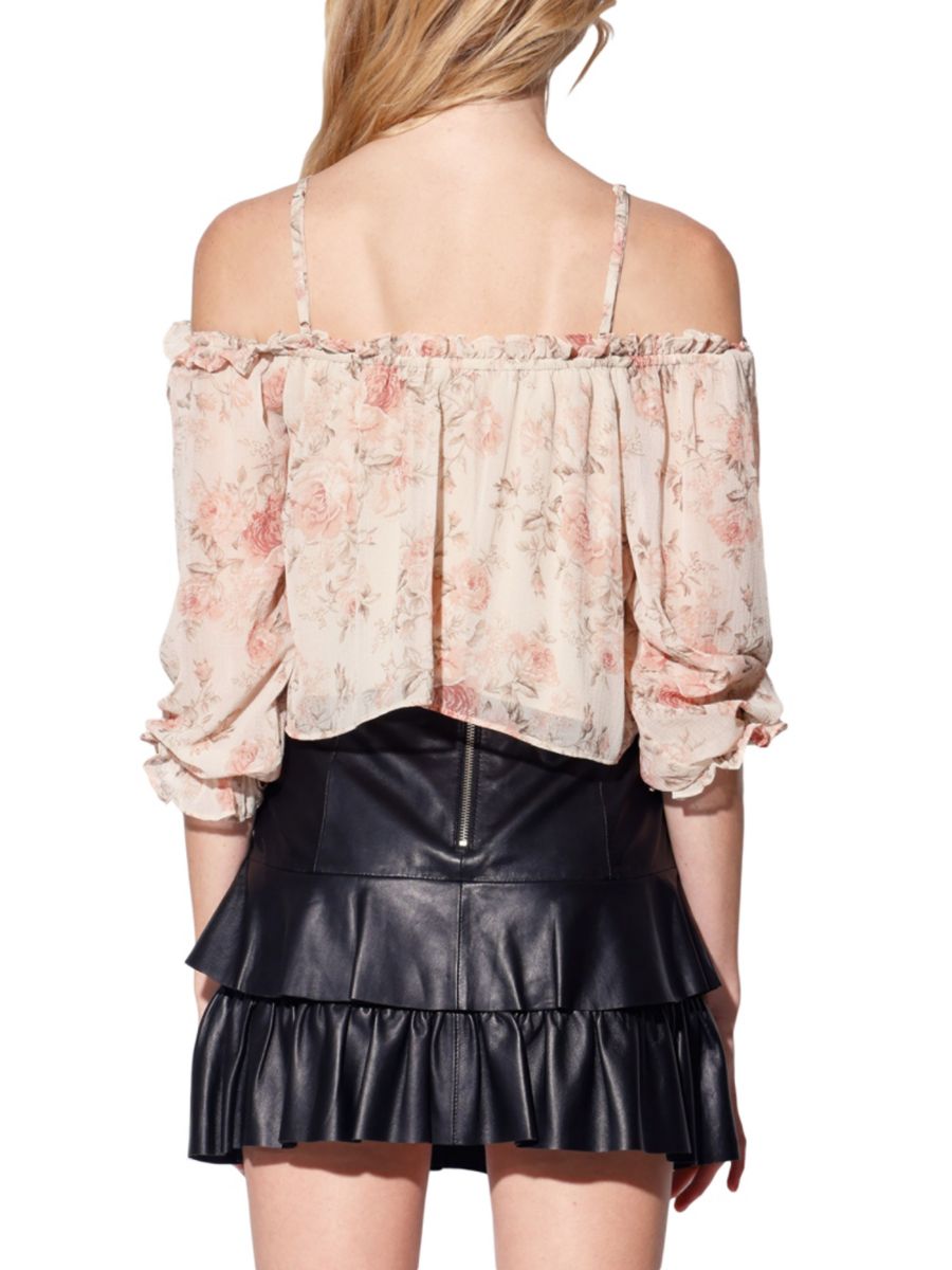 Мягкие цветочные узоры и воздушный шифон определяют этот женственный топ с открытыми плечами от Walter Baker, дополненный тонкими бретельками с наклонной застежкой и оборкой по краям из эластичной ткани. Свободные рукава и свободный силуэт дополняют образ.