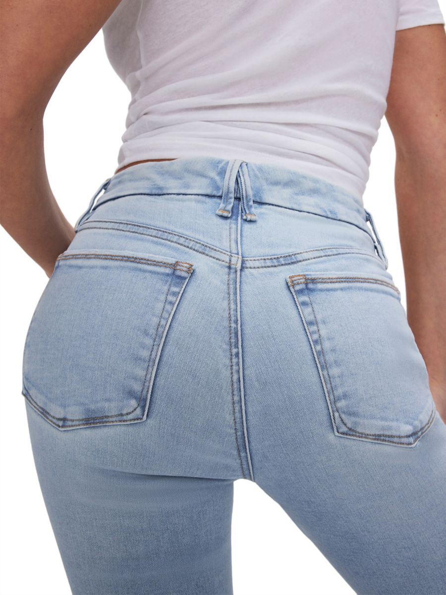 Джинсы Good Legs от Good American отличаются мини-силуэтом bootcut и укороченной длиной.