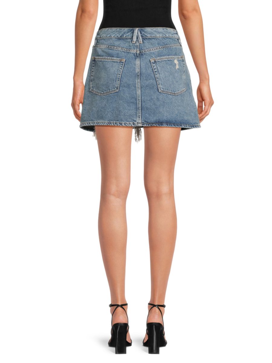 Эта джинсовая мини-юбка с потертостями от Good American имеет необработанный асимметричный верхний слой с сильно растрёпанными деталями, под которыми видны потертые края, создавая эффект деконструированной многослойности.