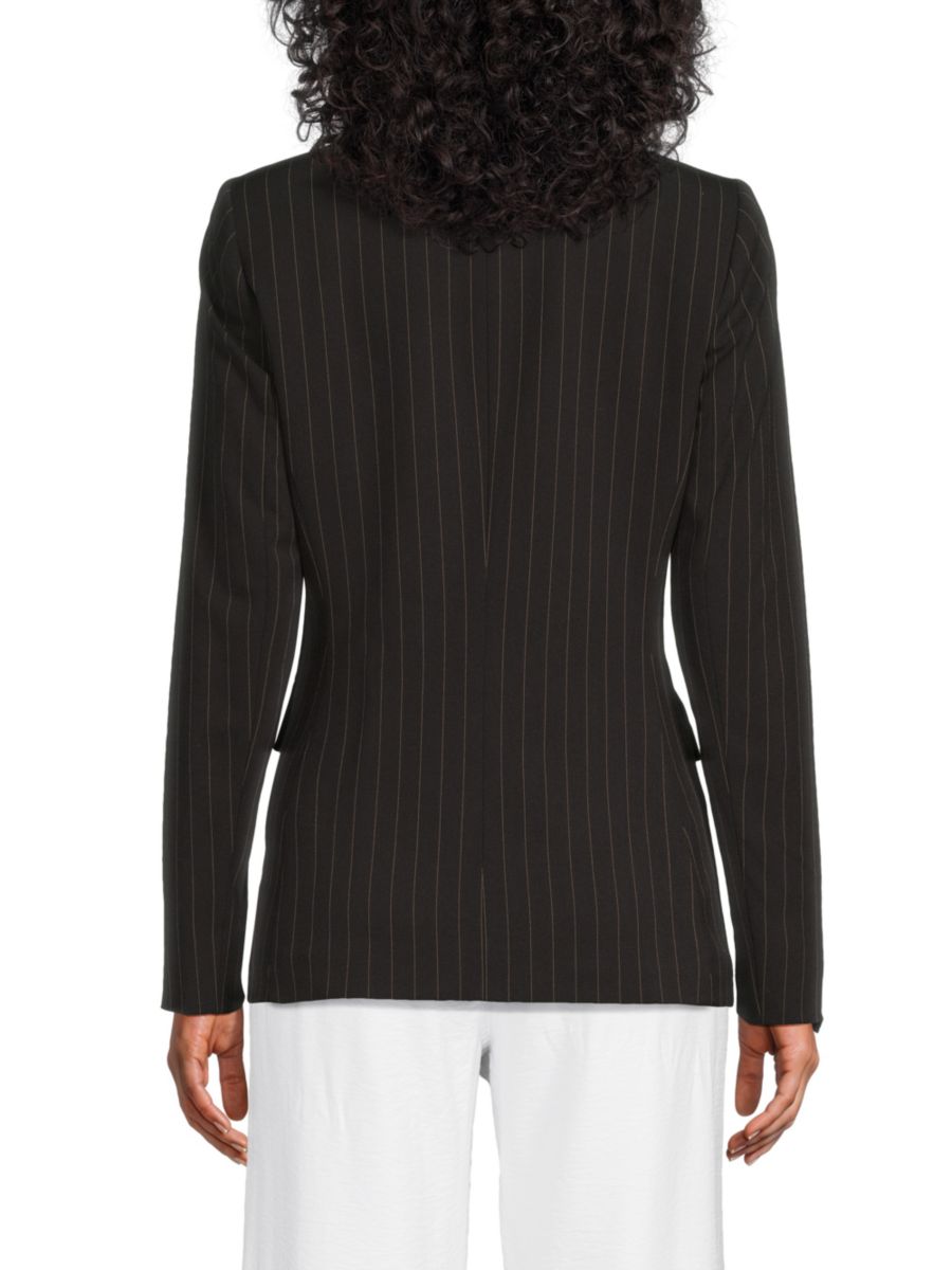 Четкие тонкие полоски придают изысканный вид этому строгому блейзеру от DKNY с заостренными лацканами и структурированными плечами. Карманы с клапанами и двубортный силуэт завершают образ.