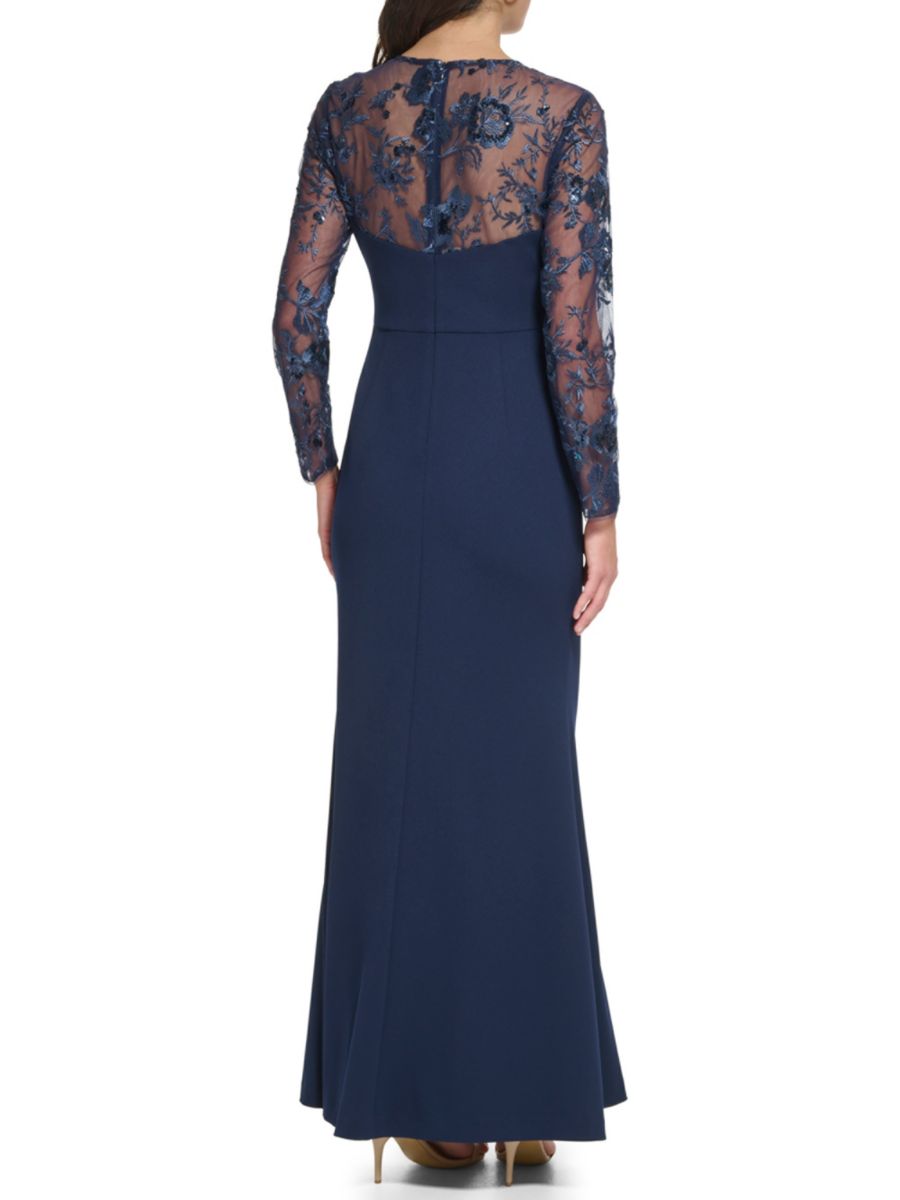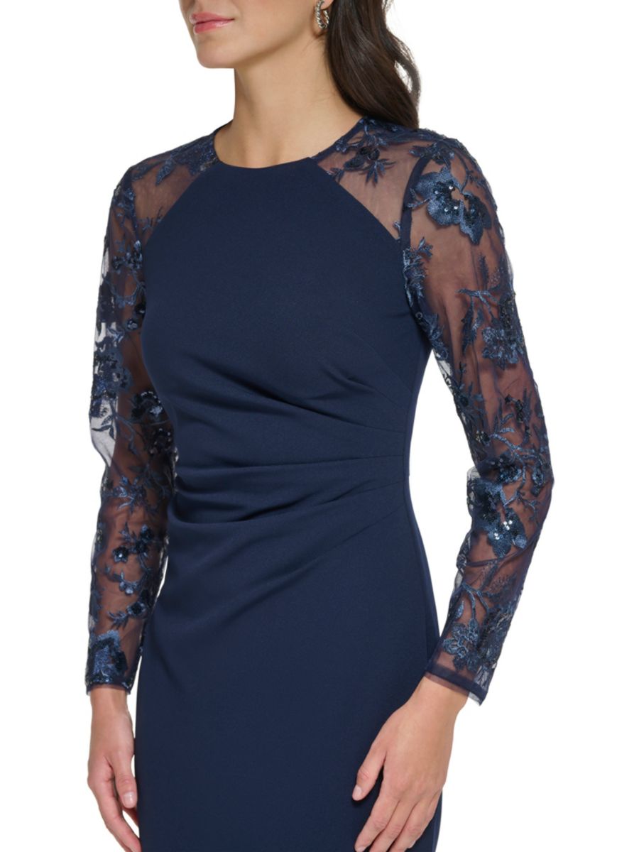 Платье из крепа с вышитыми сетчатыми рукавами Eliza J, темно-синий