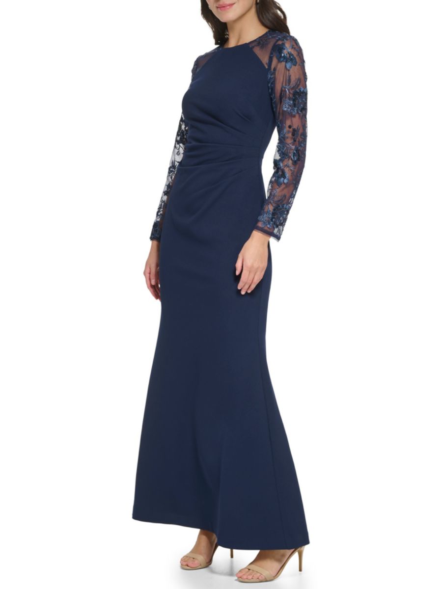 Это платье из крепа-скуба от Eliza J украшено прозрачными сетчатыми рукавами и кокеткой на спине, вышитой цветами в тон. Мягкая сборка на талии добавляет мягкую структуру силуэту длиной до пола.