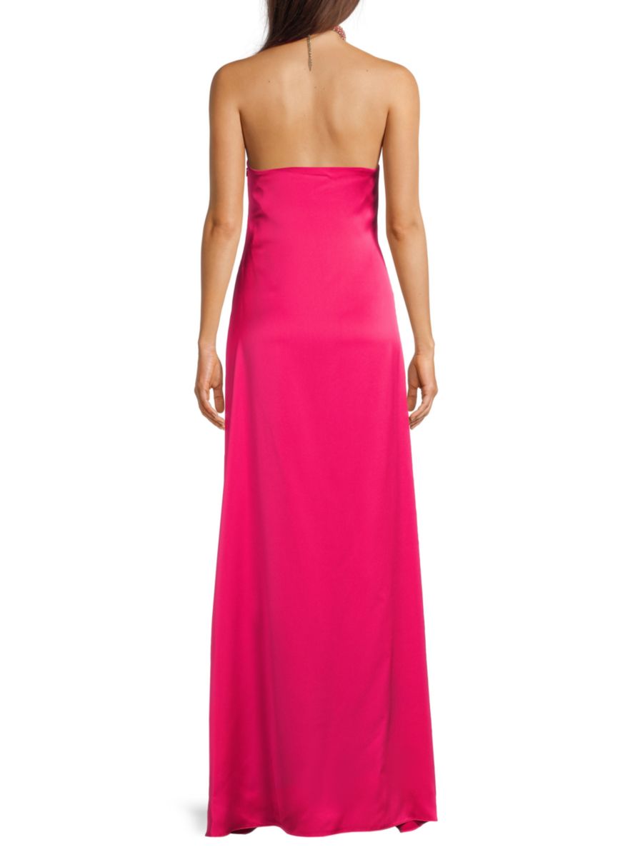 Платье Hadleigh от Ramy Brook отличается халтер-воротом и А-силуэтом, выполненным из атласа, что придает ему струящийся, блестящий вид.