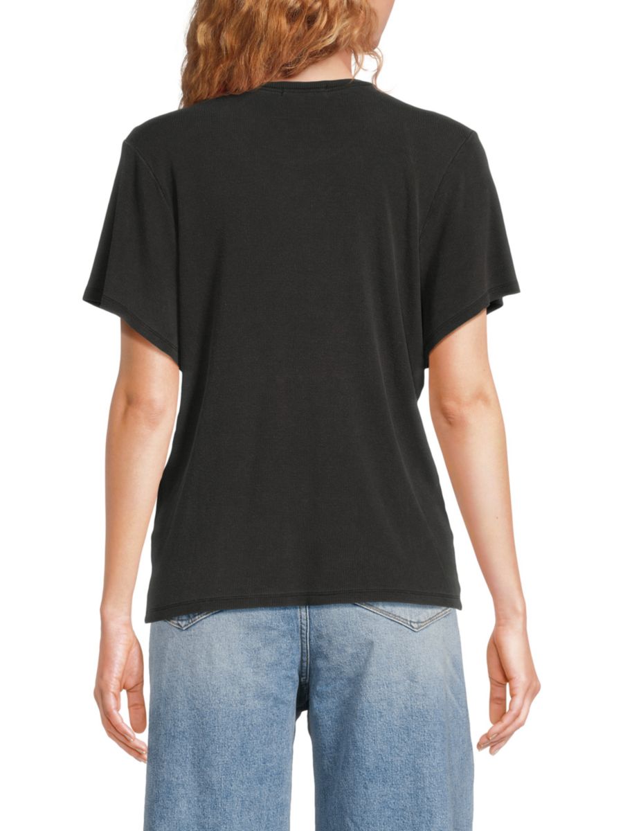 Этот топ Jeanius от Good American выполнен в рубчик по всей поверхности, имеет круглый вырез горловины и свободные короткие рукава.