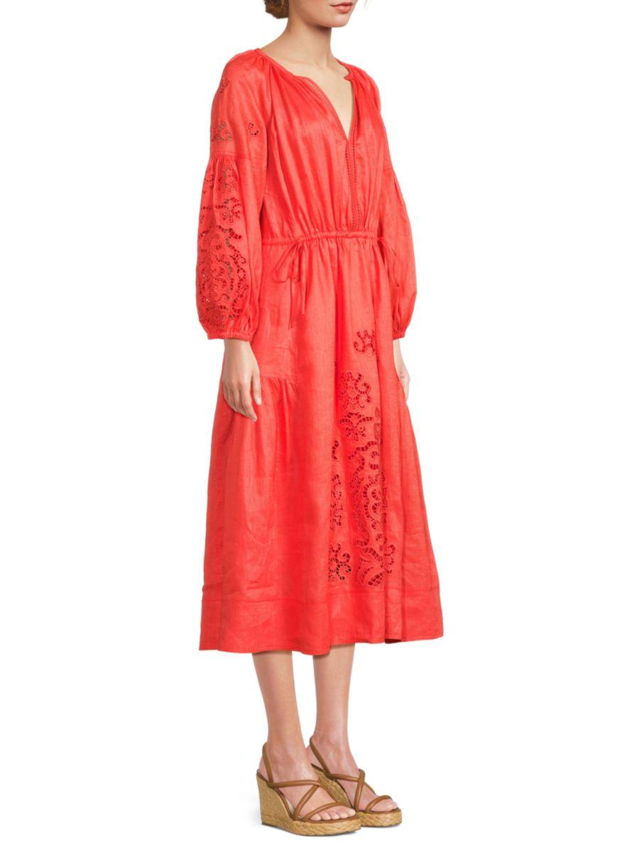 ALC представляет это миди-платье из лёгкого льна, украшенное изысканной вышивкой шиффли, которая придаёт ему текстуру и элегантность. Спущенная линия плеч и разрез горловины создают расслабленный, современный силуэт, а приталенная талия добавляет формы и чёткости.