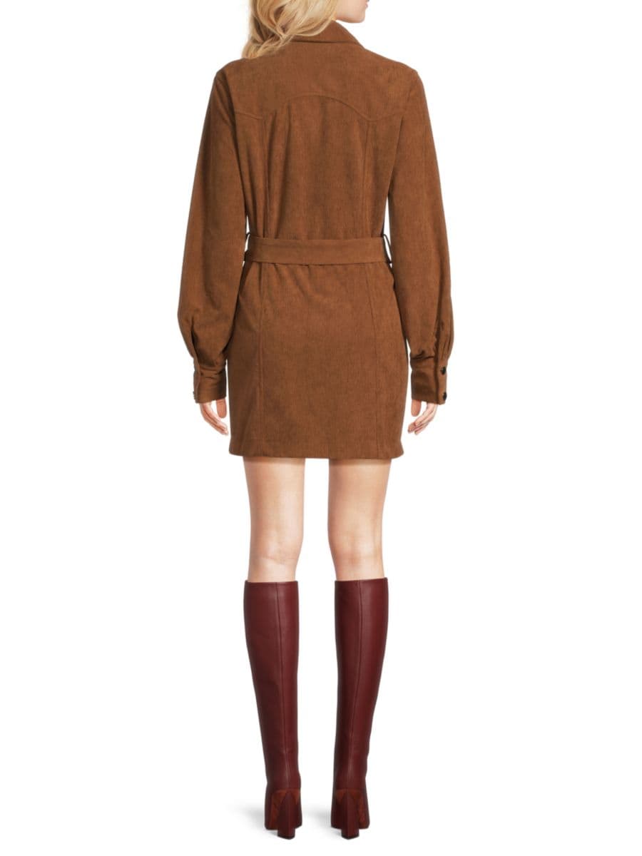 Это платье-рубашка Sosi от Area Stars, выполненное из текстурированного вельвета, имеет пояс на талии, рукава-бишоп и мини-футляр.