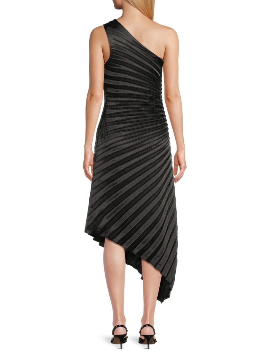 Плиссированная отделка добавляет стиль этому шикарному платью миди с силуэтом на одно плечо.