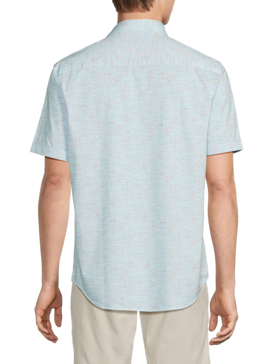 Эта рубашка от Bugatchi изготовлена из эластичного хлопка и имеет отложной воротник и короткие рукава для создания обтекаемого силуэта.