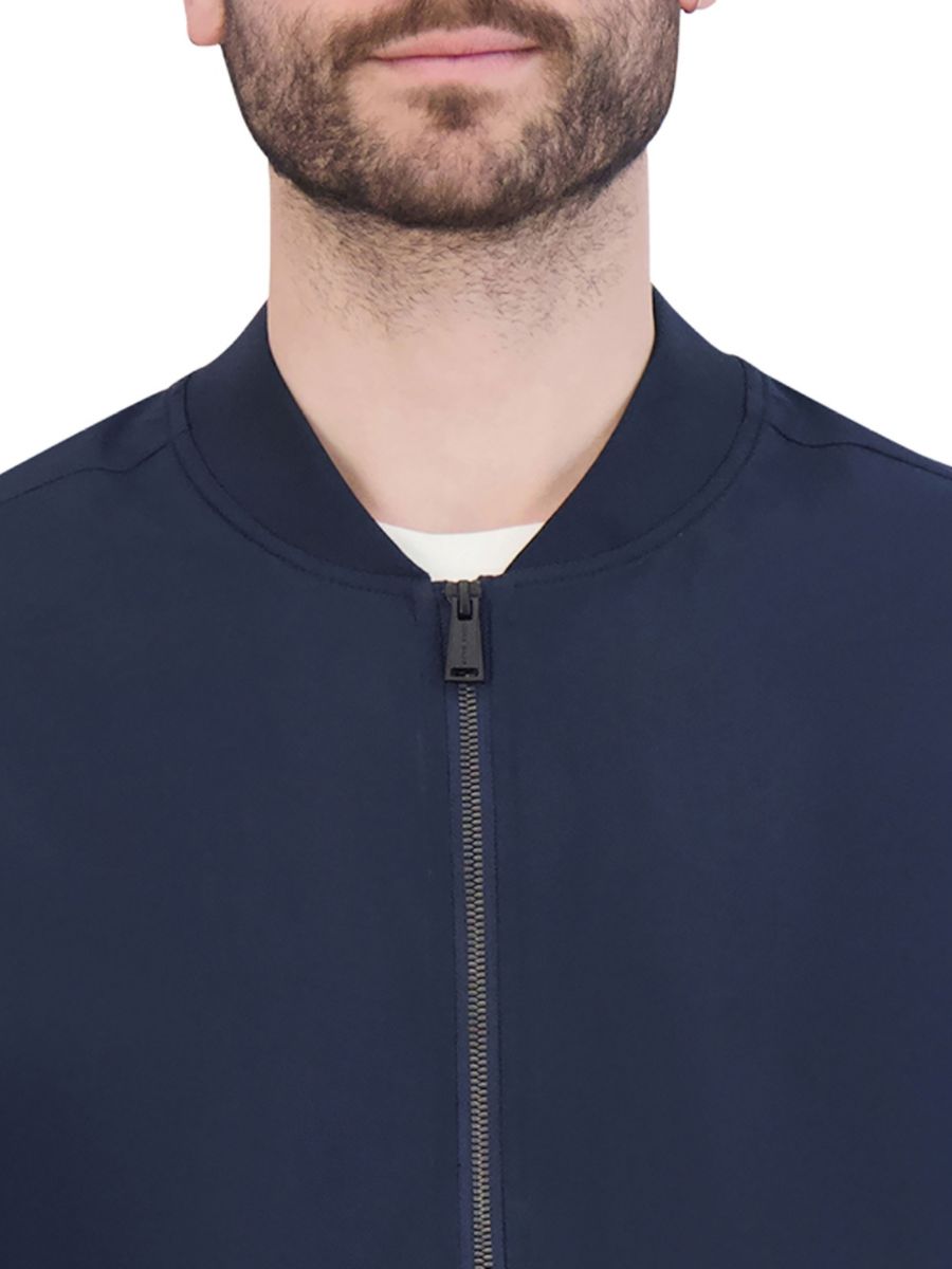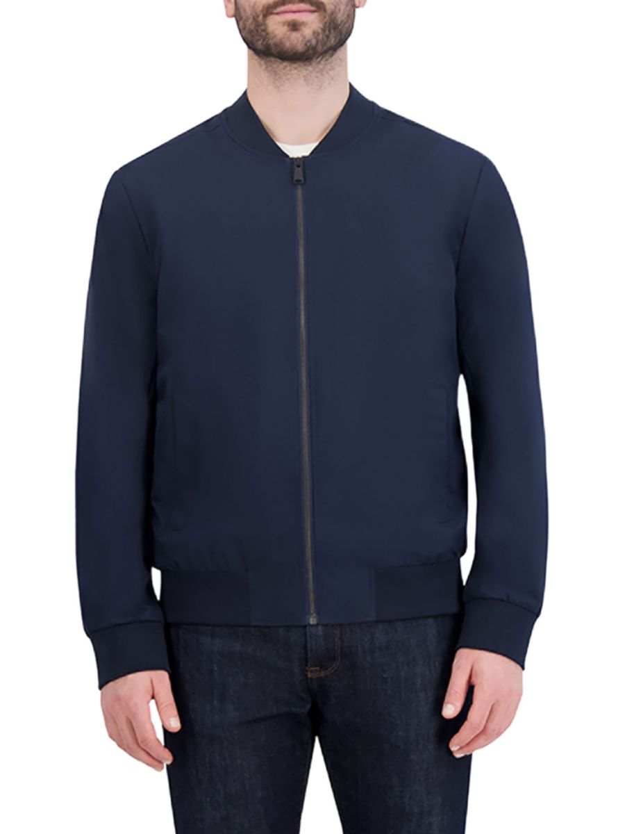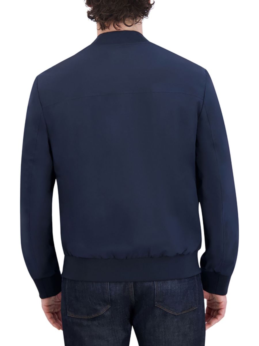 Куртка-бомбер от Cole Haan отличается элегантным дизайном с бейсбольным трикотажным воротником и манжетами в рубчик.