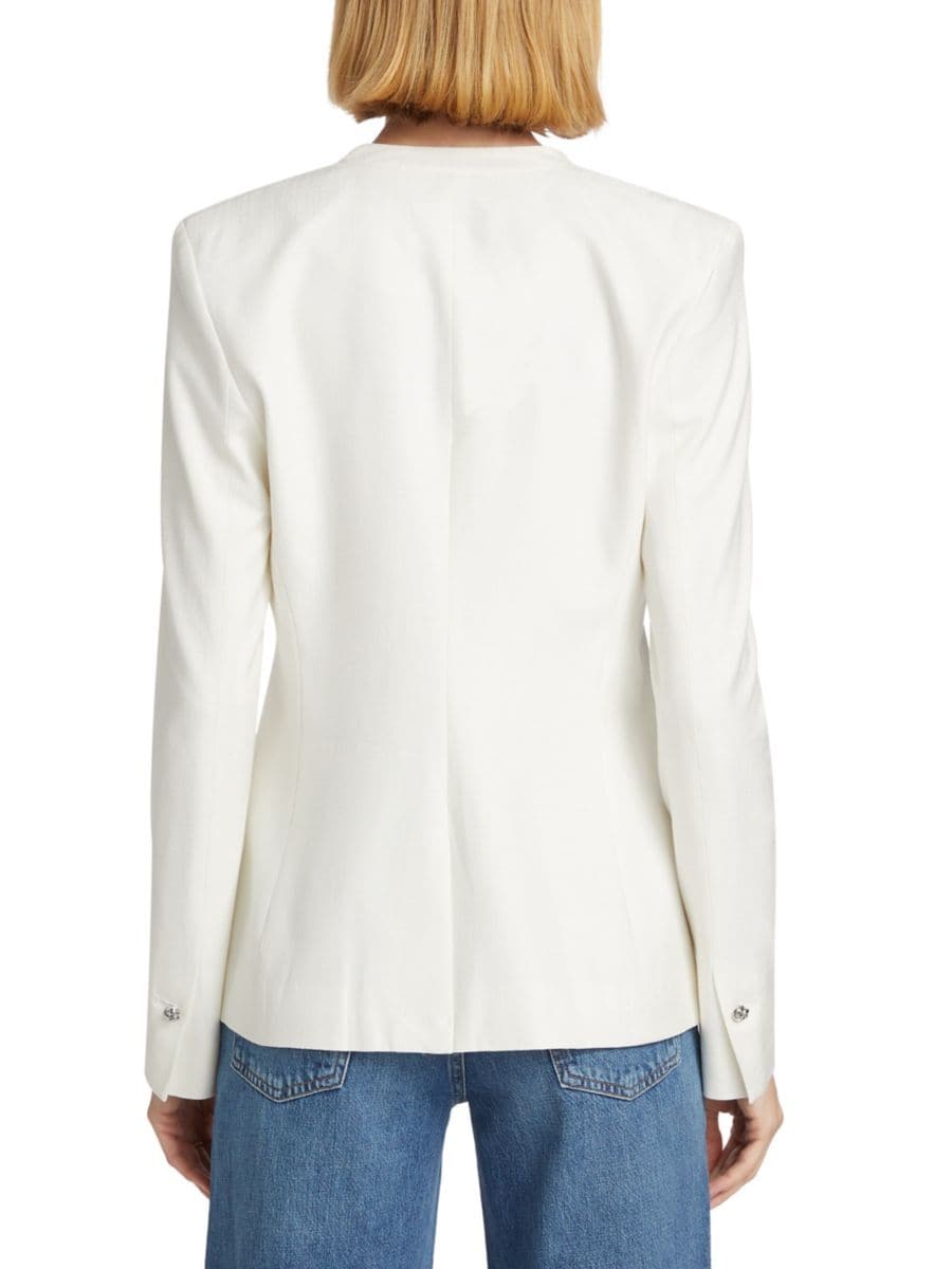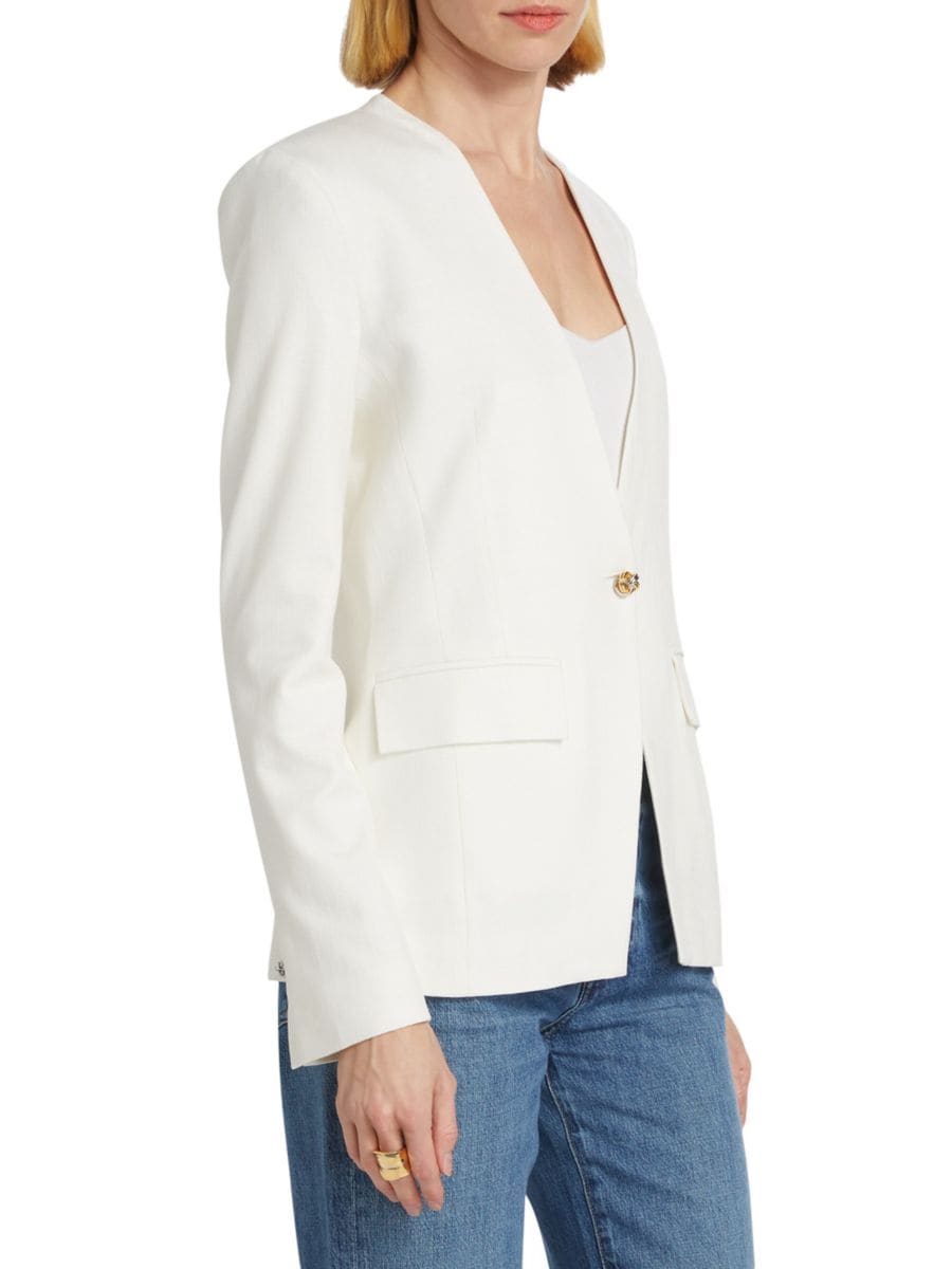 Однобортный блейзер Perez от Derek Lam 10 Crosby, облегающий фигуру, дополнен глубоким V-образным вырезом и перекрученными металлическими застежками.