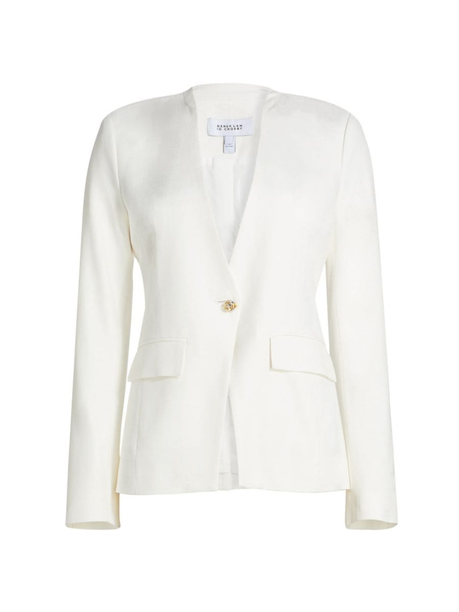 Однобортный блейзер Perez от Derek Lam 10 Crosby, облегающий фигуру, дополнен глубоким V-образным вырезом и перекрученными металлическими застежками.