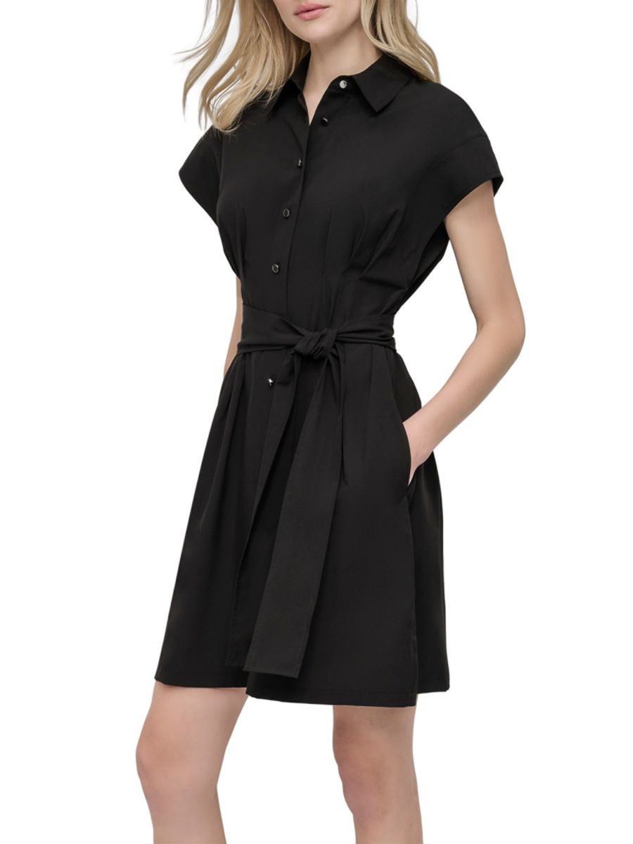 Это короткое платье-рубашка от DKNY выполнено из эластичной ткани с четким А-образным силуэтом. Острый воротник, рукава-крылышки и завязывающийся пояс подчеркивают его элегантный крой.